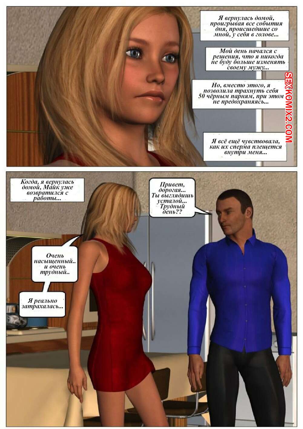 Порно комикс 50 оттенков чёрного. Часть 7 Сисястая красотка блондинка оказалась в клубе с черными парнями. Девушка возбудила парней своим шикарным телом в белом белье и они сразу дали красотке отсосать свои большие хуи, после чего хорошенько ее выебали.