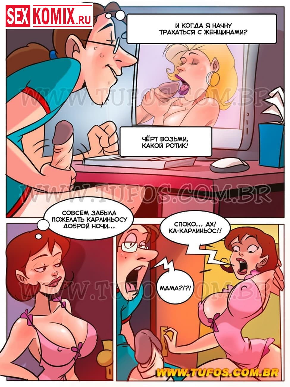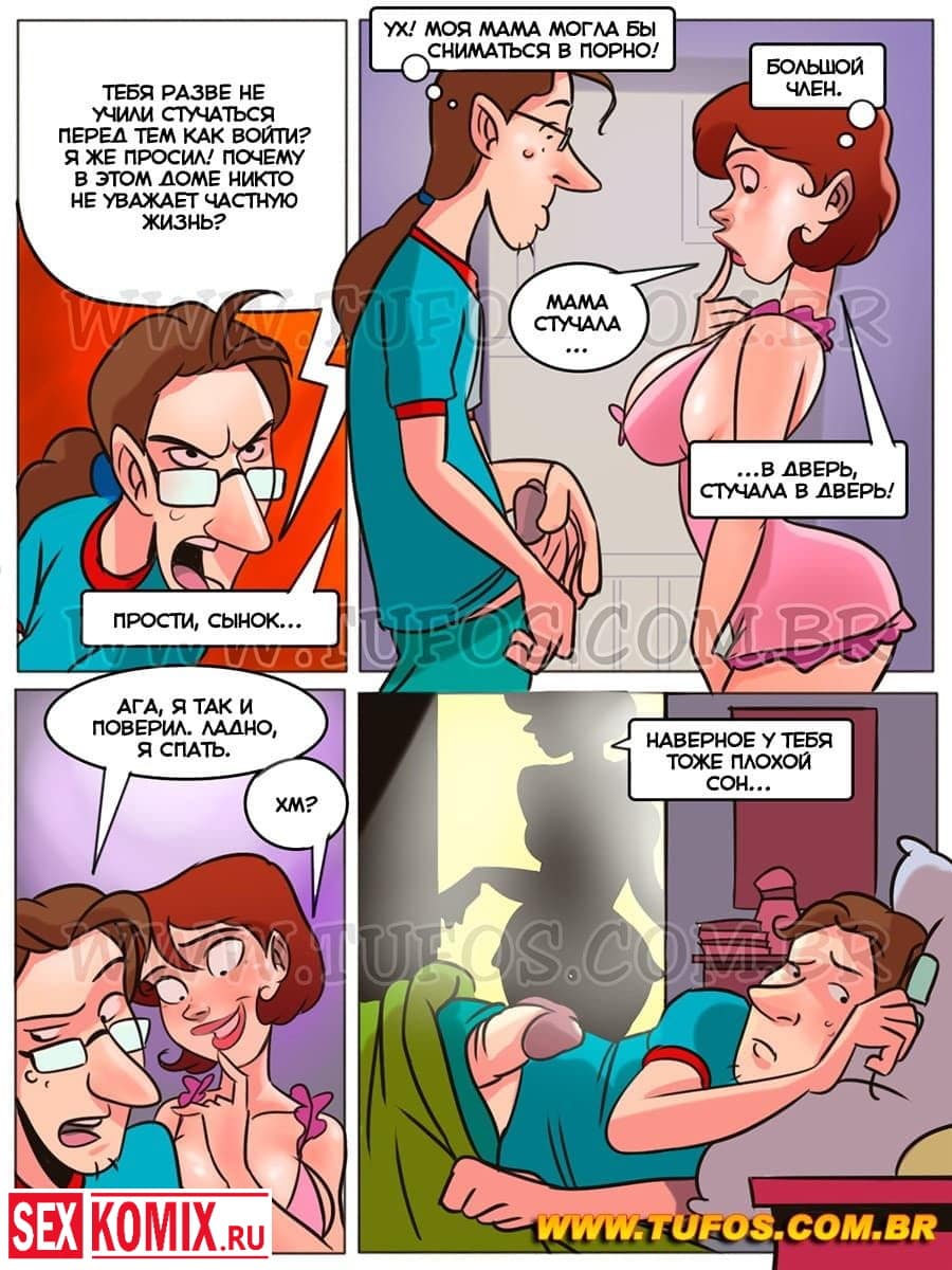 Порно комикс Похотливая семейка. Часть 2. Дорогая мама. На этот раз повзрослевший парень хотел спокойно подрочить в своей комнате на ночь, но в самый ответственный момент к нему в комнату без стука вошла шикарная мама, чтобы пожелать спокойной ночи, тем самым, обломав весь кайф ему. Но умная женщина решила компенсировать свою грубую ошибку по особенному, она взяла в свои руки стоящий член и нежно отсосала его. А после этого сняла свои мокрые трусики и села сверху на огромный член, милфа трахнула парня по полной программе.