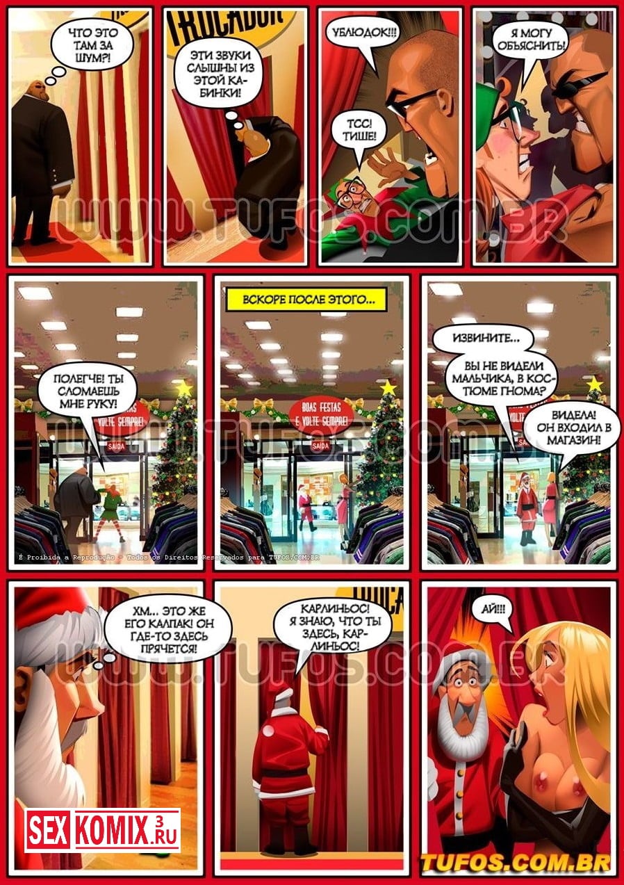Порно комикс Семейка богатеев. Часть 7. Рождество с семейкой Развратос. Карлос смог получить работу Санты в торговом центре и взял с собой Анину и Крлитоса. Пока они стояли у ёлки мимо прошла горячая блондинка и Карлитос узнал в ней, Инстаграм модель на которую он не раз дрочил дома. Парень решил за ней проследить и проник в соседнюю кабинку примерочной, а когда красотка разделась начал её фотографировать просунув телефон снизу. Но девушка его заметила, она не разозлилась, а наоборот предложила сделать её анилингус, на что Крлитос с большой радостью согласился.