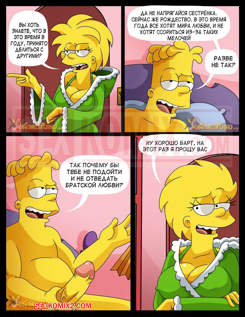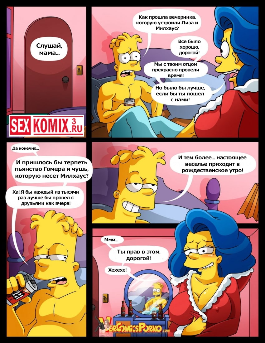 Порно комикс Симпсоны. Молочное Рождество. Развратная Мардж решила сделать своему сыну Барту подарок на рождество. Он весь год вел себя хорошо и у него не было проблем с полицией, парень заслужил лучший подарок. Женщина сняла с себя халат, а под ним сексуально бельё натянутое на огромные сиськи милфу, член Барта встал за одну секунду и был готов принимать подарок. Но женщина не торопилась, она дала вылизать свою киску, дела на член парня рождественский презерватив и пригласила посетить свою горячую вагину.