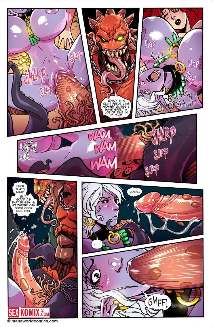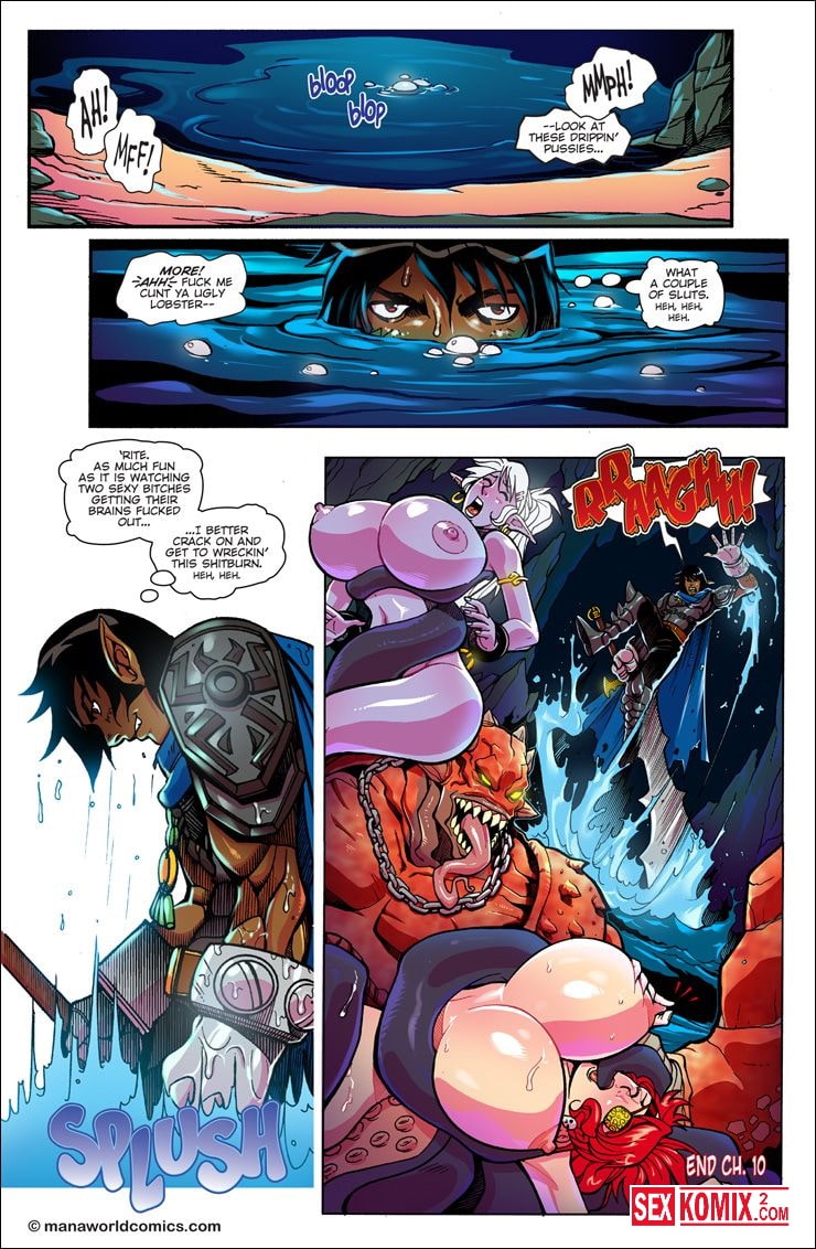 Порно комикс ManaWorld. Часть 10. Старые друзья. Английский. Две девушки девушка эльф в белыми волосами и женщина капитан с красными волосами попали в плен к подводным людям. Их решили отдать в жертву к злобному существу, но когда он увидел красоток, захотел только насладиться сексом с ними.