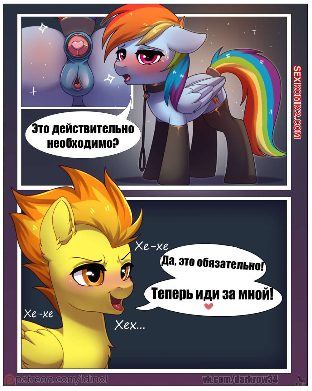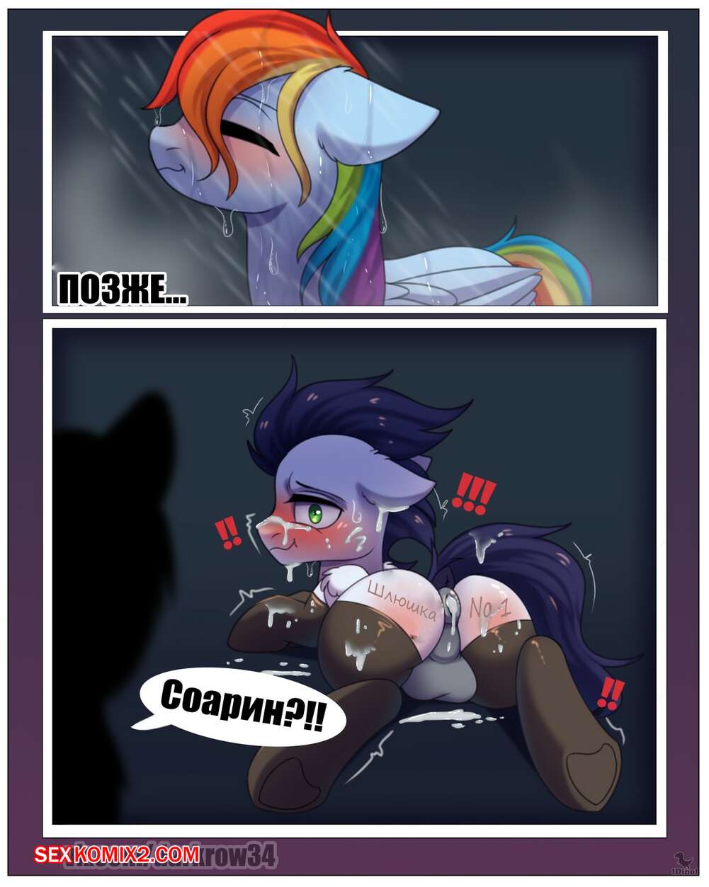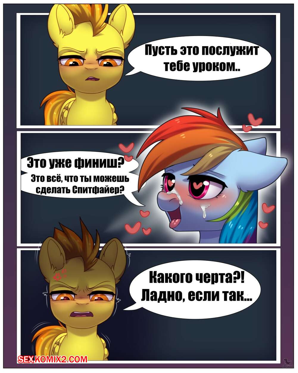 Порно комикс My Little Pony. Приключения Рейнбоу Дэш. Часть 3. idinol Горячая красотка пони были очень возбуждена и решила повеселиться со своим дружком. Она разделась перед парнем и стала сосать его большой хуй, после чего дала ему себя выебать.