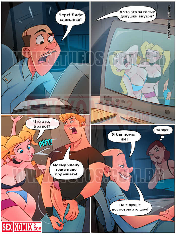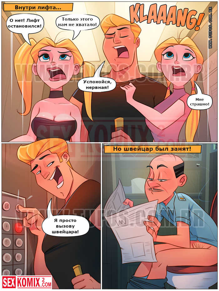 Порно комикс Семья Распутос. Часть 9. В лифте. Парень с двумя красотками ехал в лифте и он сломался по середине пути. Но ребята не растерялись и занялись горячим сексом.