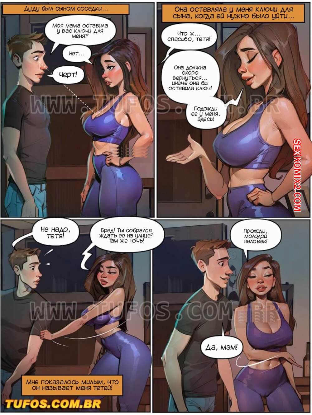 Порно комикс Наслаждение сумасшедшей жизнью. Часть 4. Йога на кухне. Tufos Сексуальная брюнетка занималась йогой на кухне, но ей помешал соседский парень, который пришел за ключом. Девушка впустила его к себе, чтобы он дождался возвращения мамы, что пойти домой. Дуду возбудился, при виде шикарного тела соседки, поэтому она не сдержалась и дала парню себя выебать.