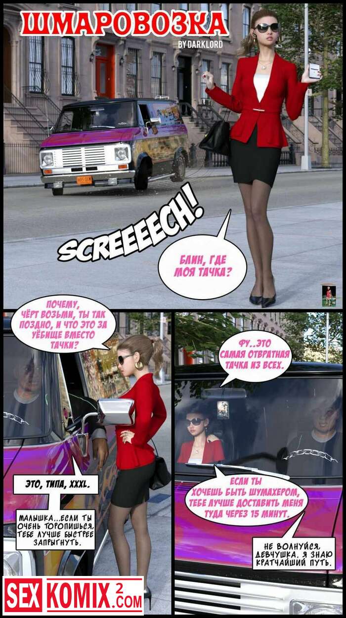 Порно комикс Шмаровозка. Мужчина подвез красотку, и она всю дорогу ныла, ему это надоело. Он остановил фургон и трахнул блондинку на заднем сидении.