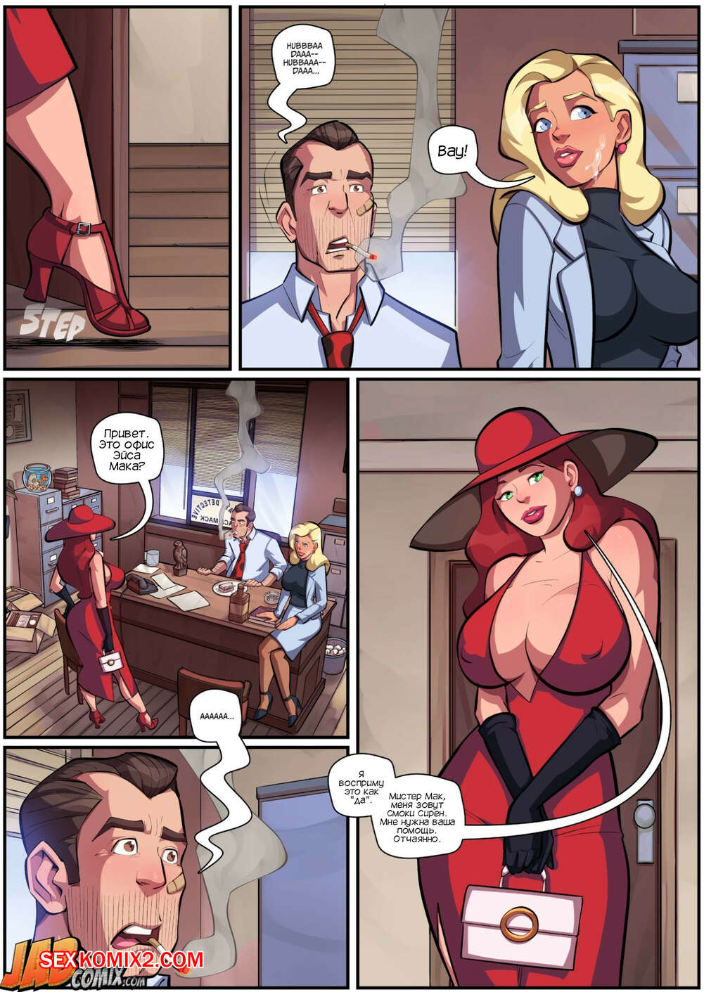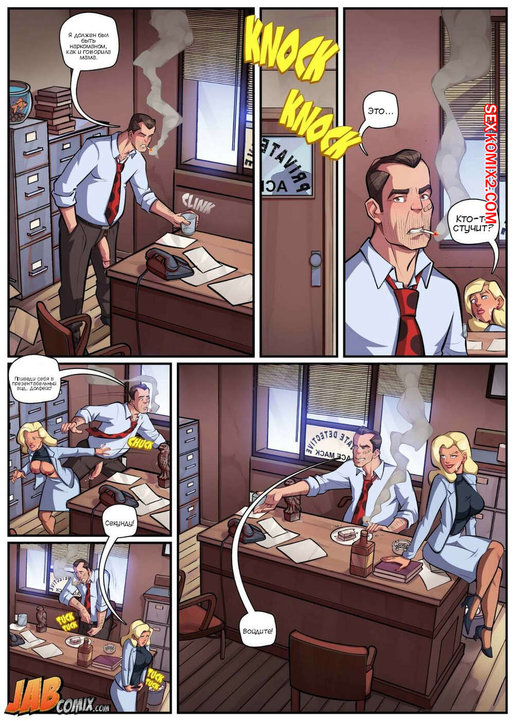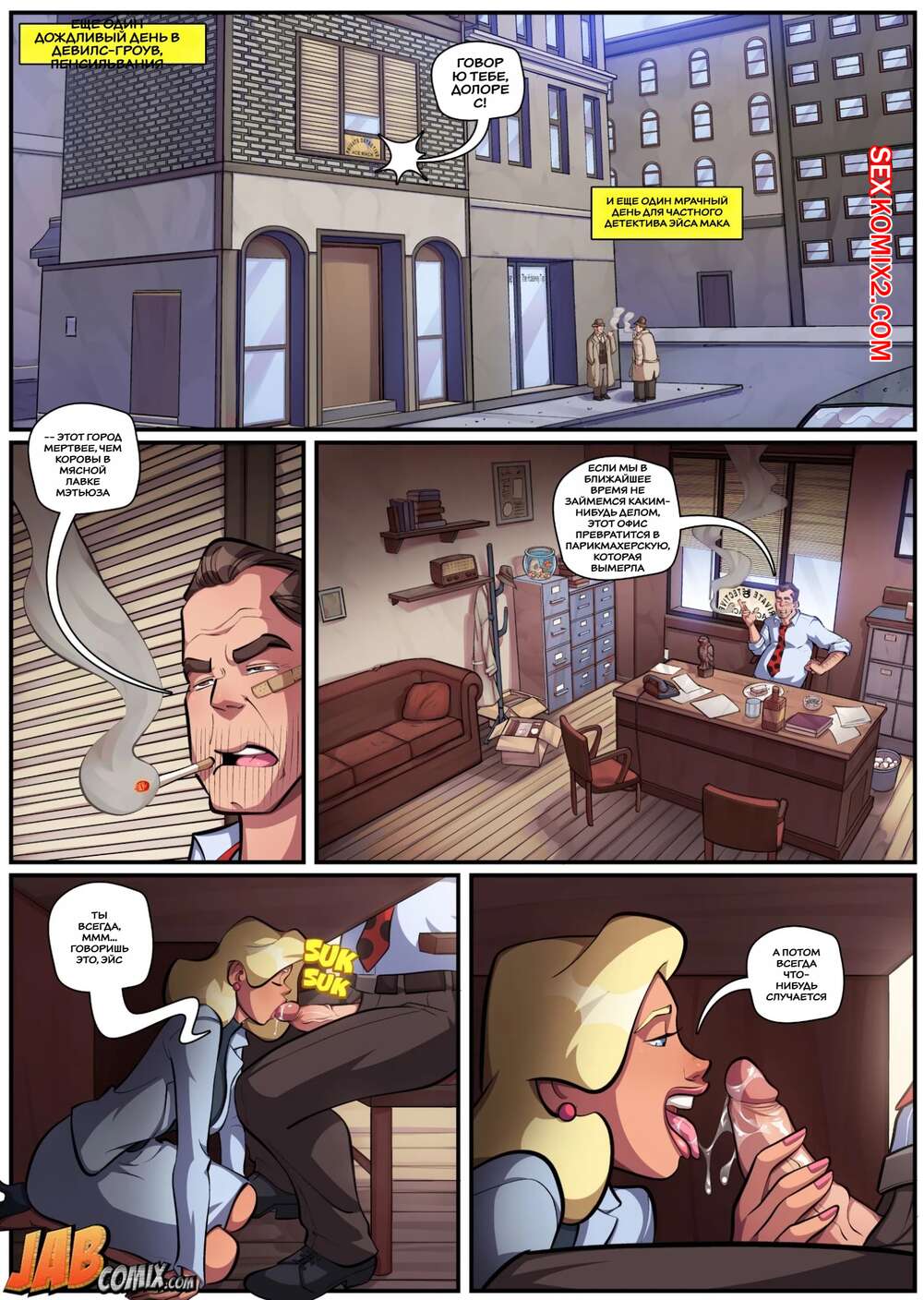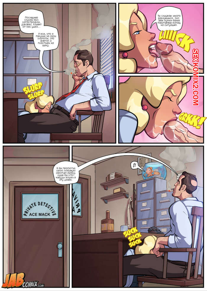 Порно комикс Член. Dick. JabComix Детектив работал в своем офисе над очередным телом и был очень напряжен. Сисястая блондинка милфа решила помочь своему боссу расслабиться, поэтому она залезла к нему под стол и стала сосать его большой хуй.