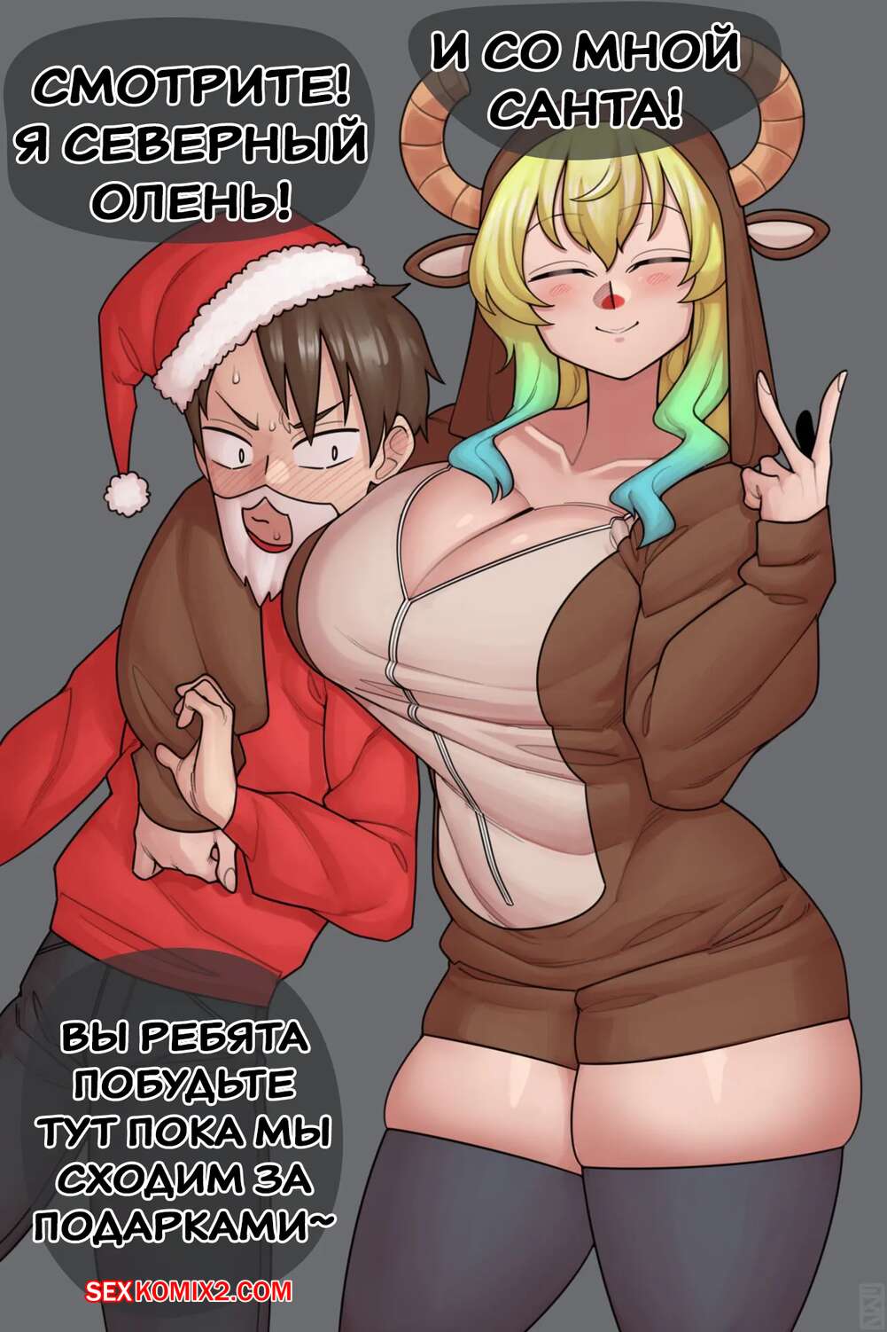 Порно комикс Рождество Лукоа. Lucoa Xmas. EKZ Сексуальная блондинка решила устроить сюрприз своему друкжку. Красотка встала перед ним на колени и стала дрочить большой хуй парня своими сиськами, помогая ему кончить.