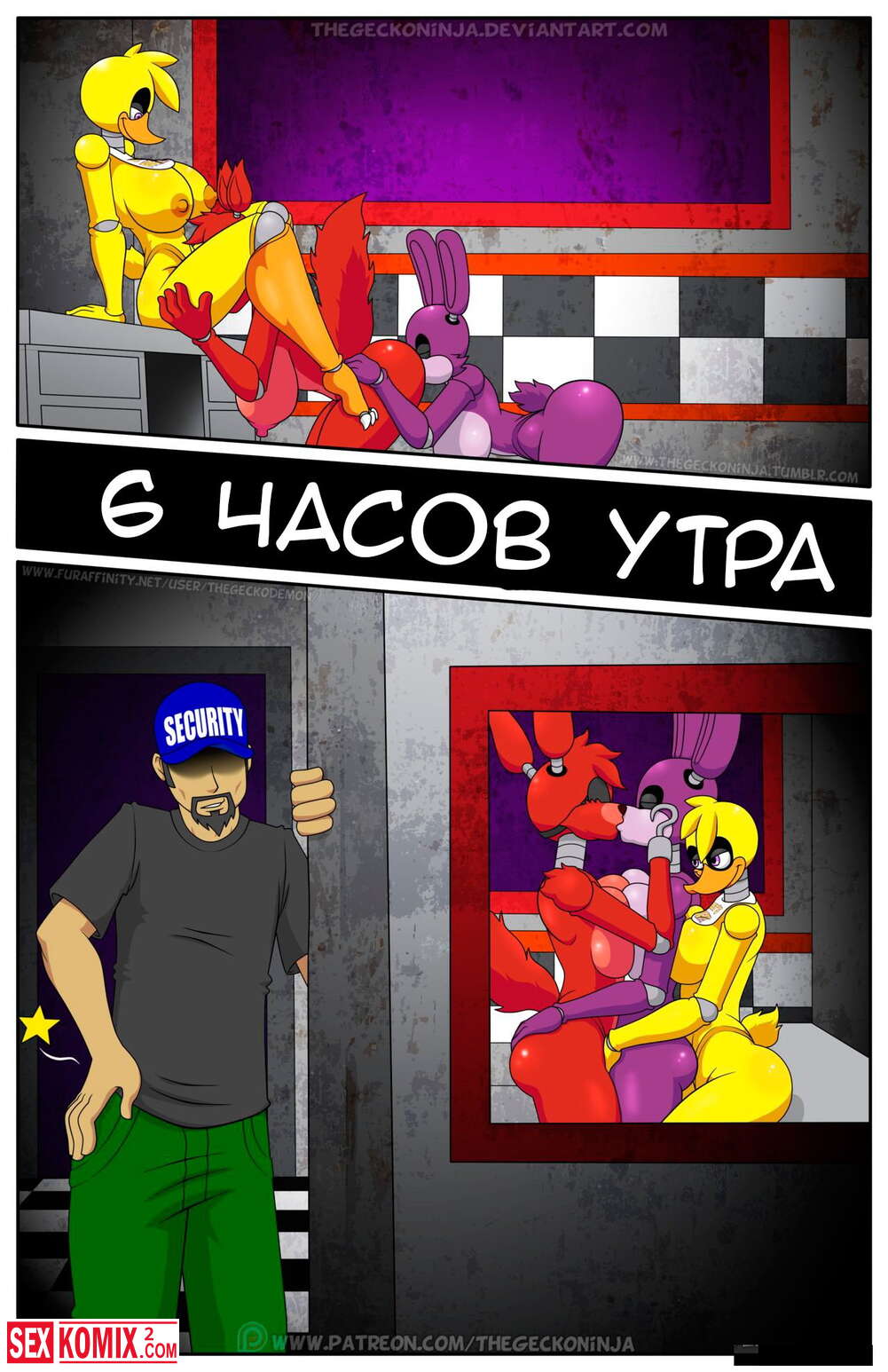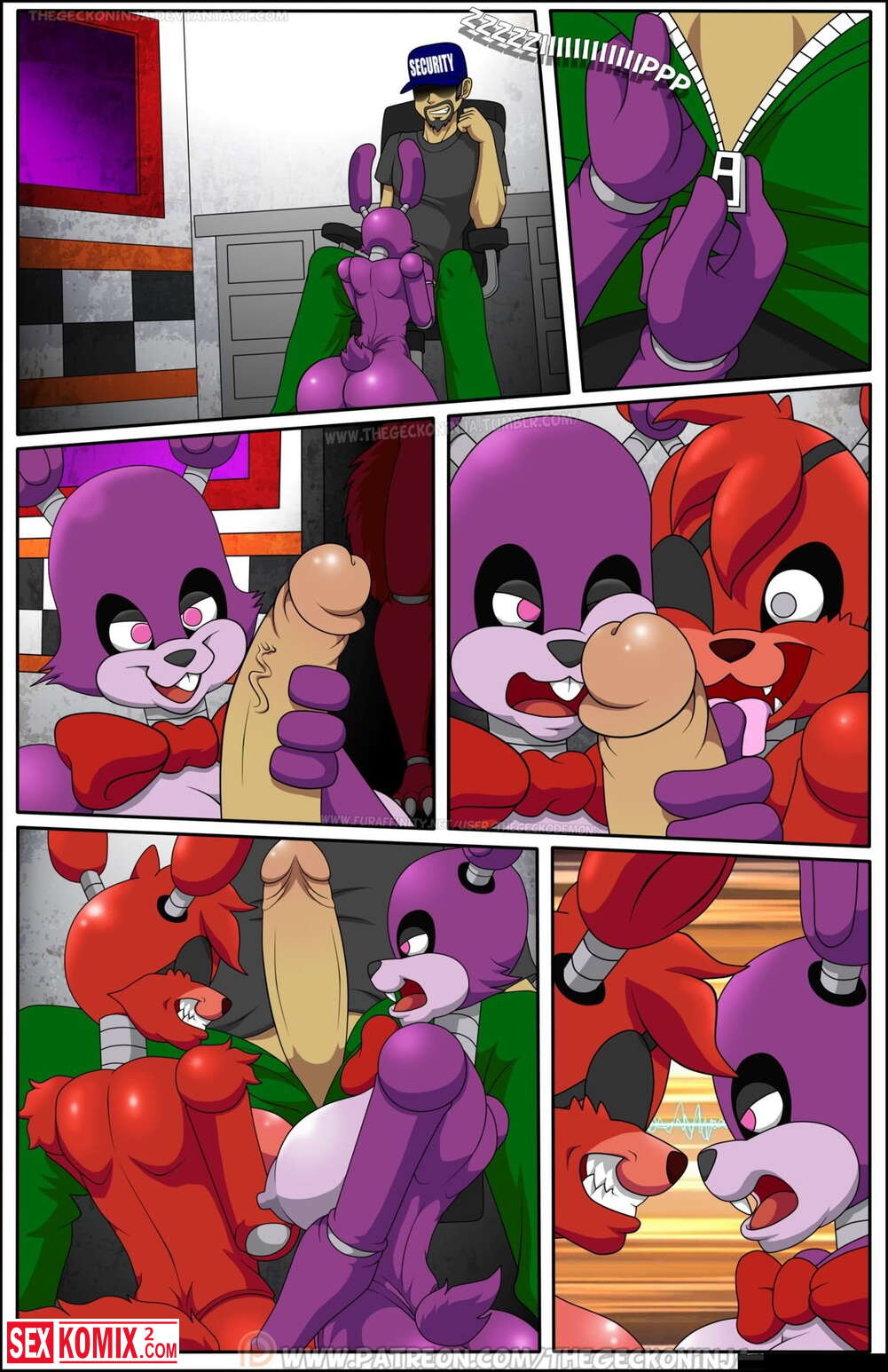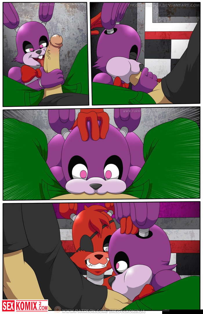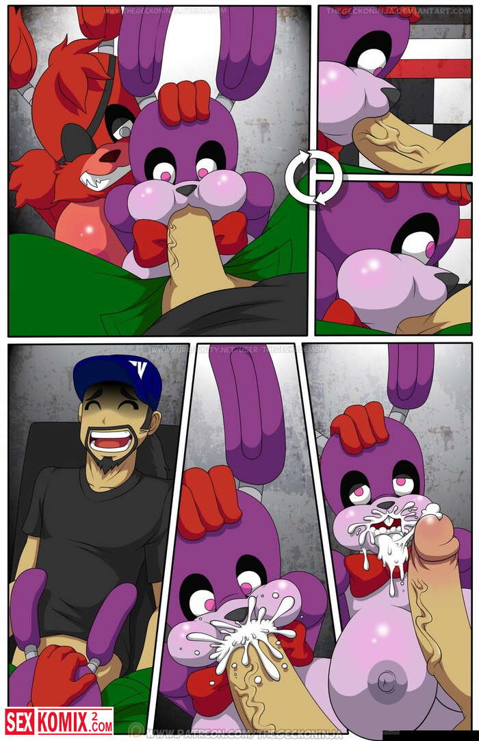 Порно комикс Пять ночей с Фредди. По мотивом одноименно игры, парень остается на ночь с озабоченными фурри куклами и нужно удовлетворять их и так все 5 ночей.