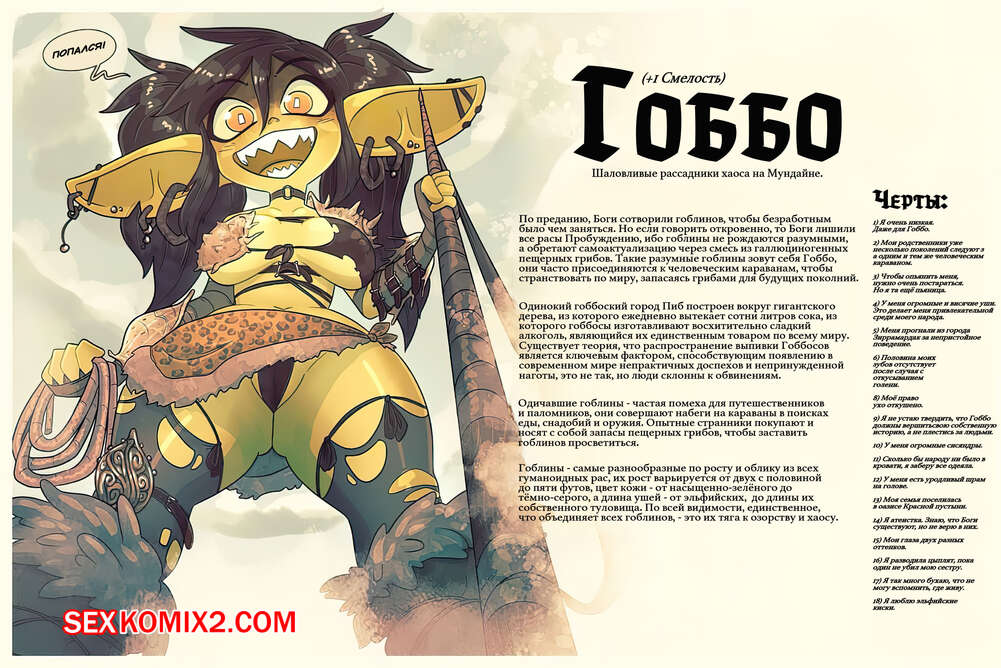 Порно комикс Ограбление по гоблински. Rob the Gob. Rapscallion Горячая брюнетка гоблин с большим членом была очень возбуждена и решила повеселиться со своей подругой. Она раздела ее и дала отсосать ей свой большой хуй, после чего выебала пизденку девушки и заполнила своей спермой.