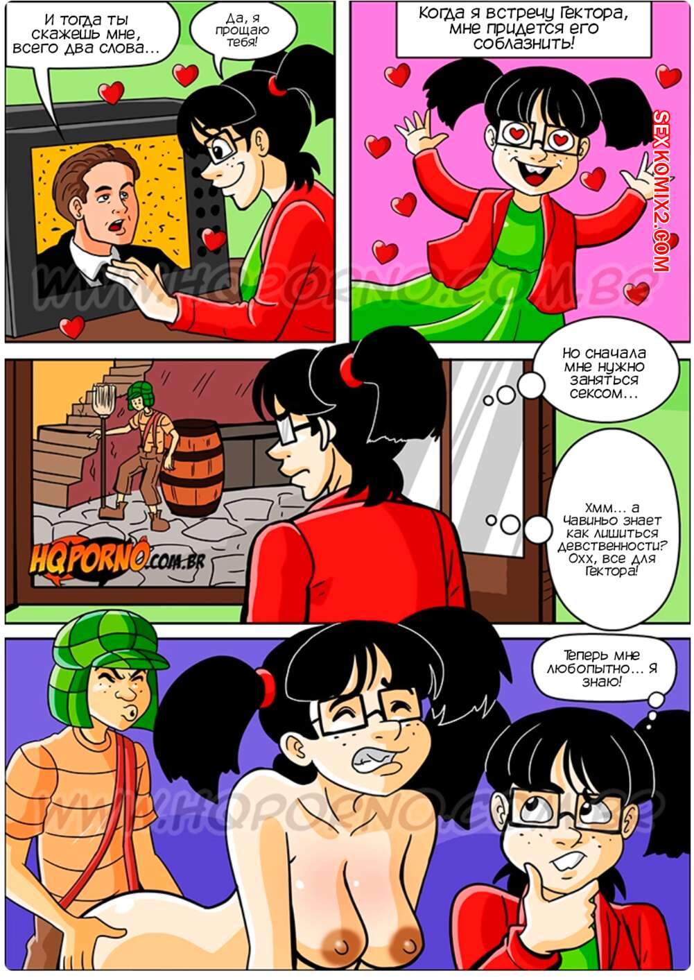 Порно комикс Чавиньо. Часть 17. Chavinho. HQporno Чикита стала настоящей шлюхой и нам предстоит узнать как девушка лишилась девственности. Красотке было любопытно заняться сексом, поэтому она уедининалсь с Чавиньо и Кику и дала парням выебать себя во все дырочки.