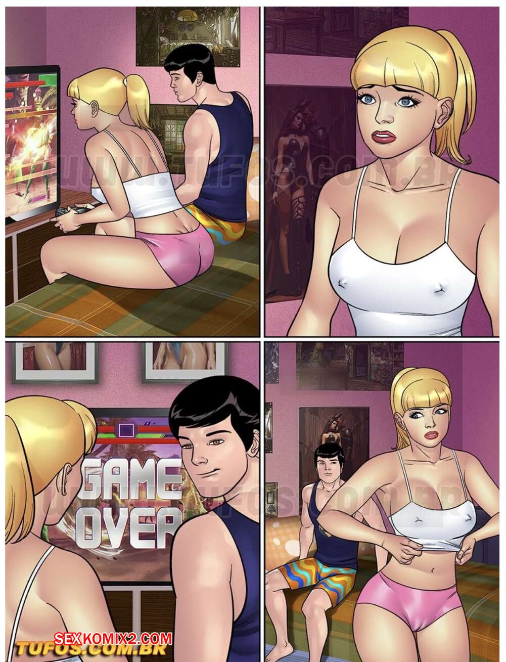 Порно комикс Фэнтези принадлежит вам. Часть 4. Игра в приставку. A Fantasia В Sua. Tufos Сексуальная блондинка играла с братиком в приставку на раздевание. Красотка проиграла и стала сосать большой хуй парня, после чего он выебал сестренку во все дырочки.
