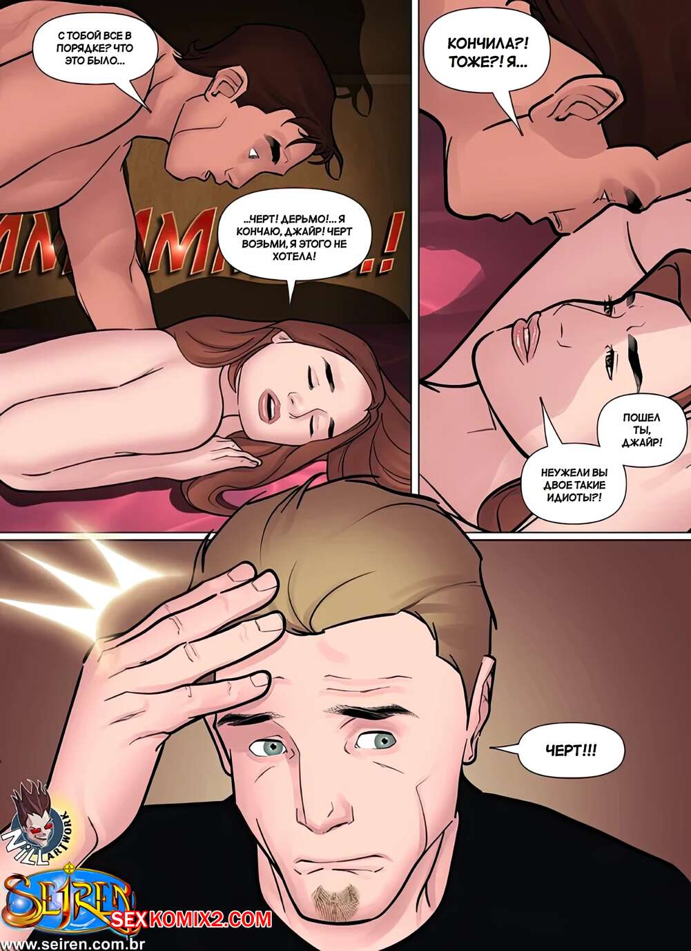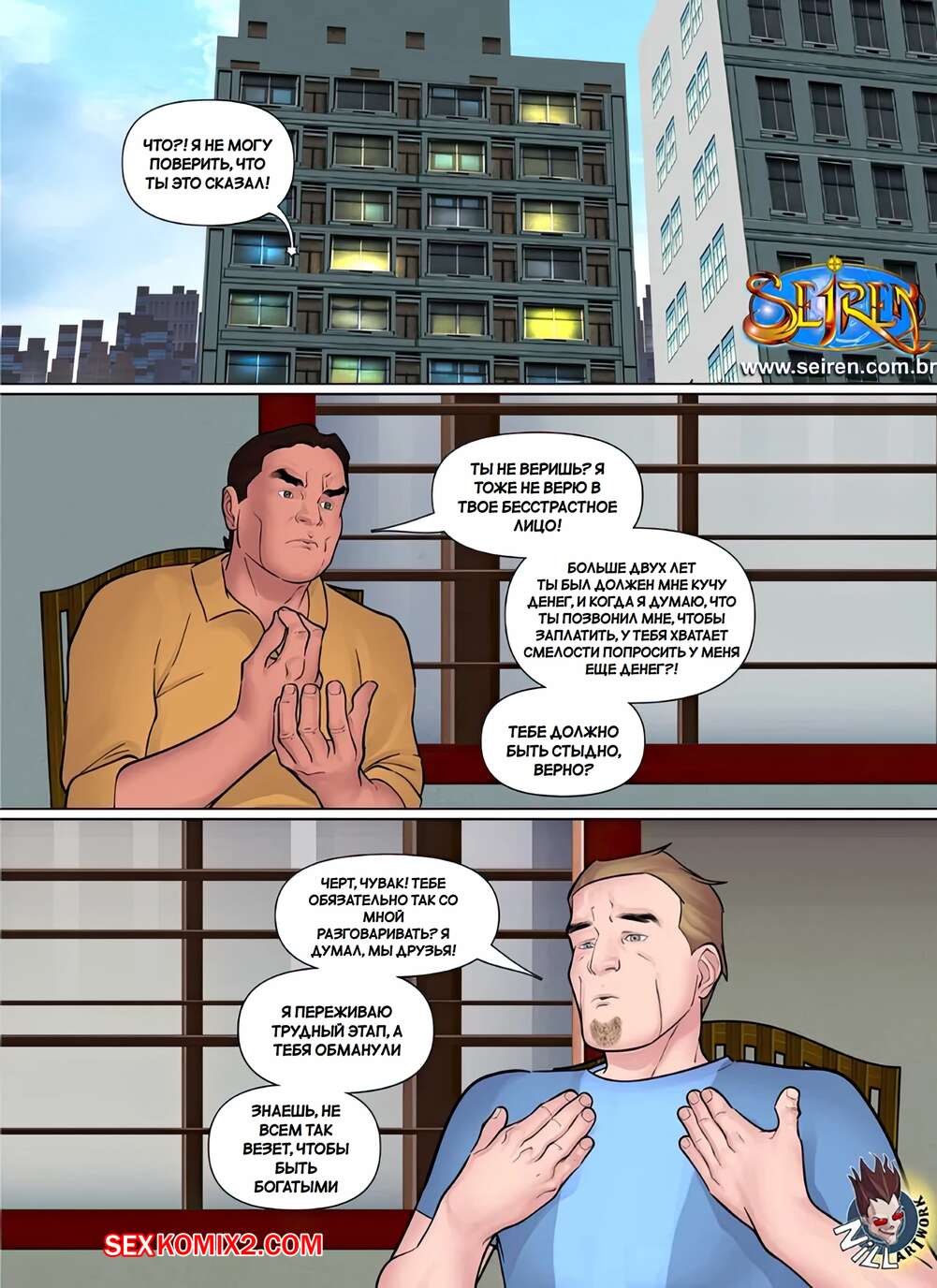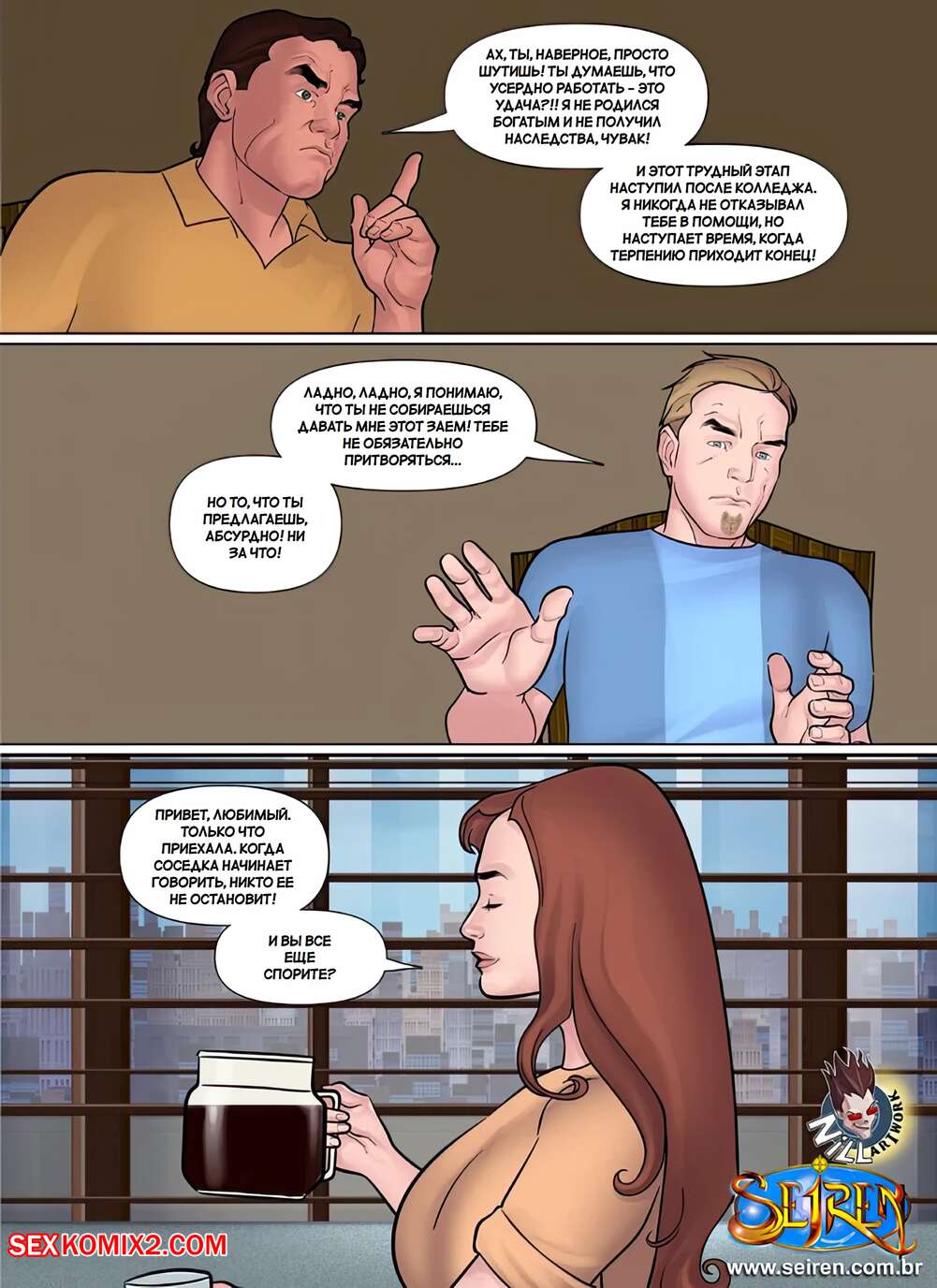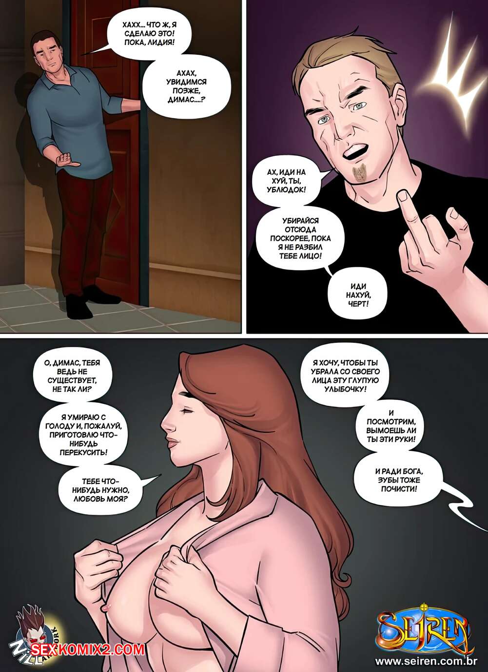 Порно комикс Дискредитировать. Часть 1. Discredit. Seiren. Парень задолжал деньги своему другу и они нашли способ расчитаться. Жена должника разделась перед дружем мужа и дала ему выебать свою пизденку, кончая ей в ротик.