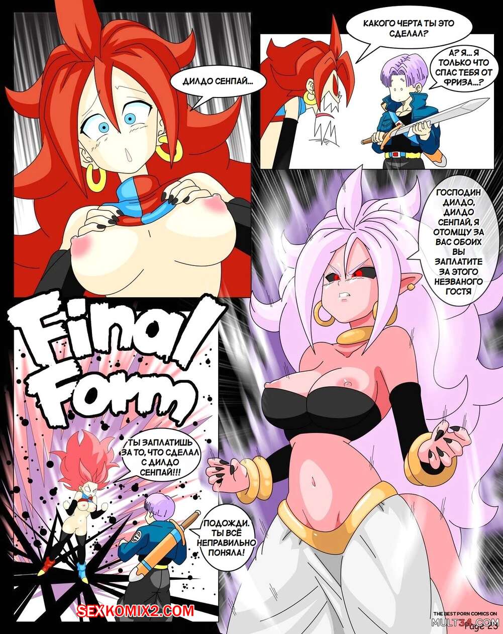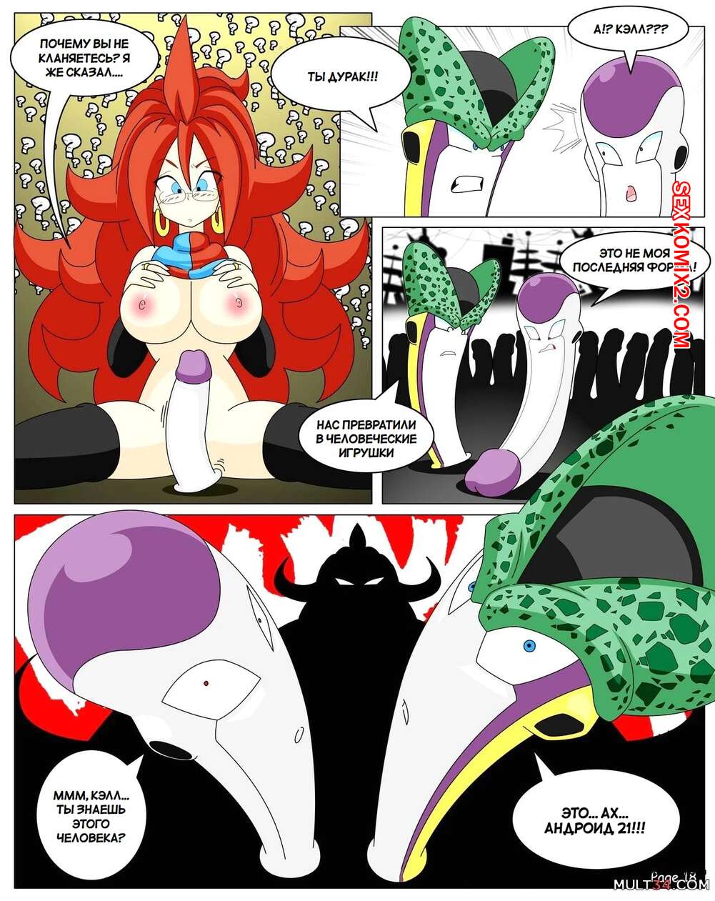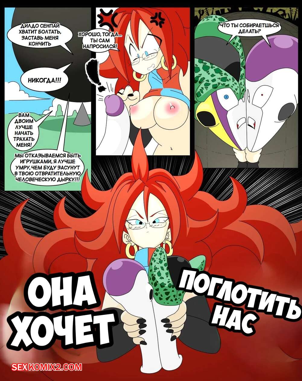 Порно комикс Dragon Ball. Сага Андроид 21. Yamete Android 21 Saga Горячая красотка была очень возбуждена и хотела трахаться. Она разделась и стала ласкать свою пизденку с помощью дилдо, после чего к ней присоединились два парня и выебали ее во все дырочки.