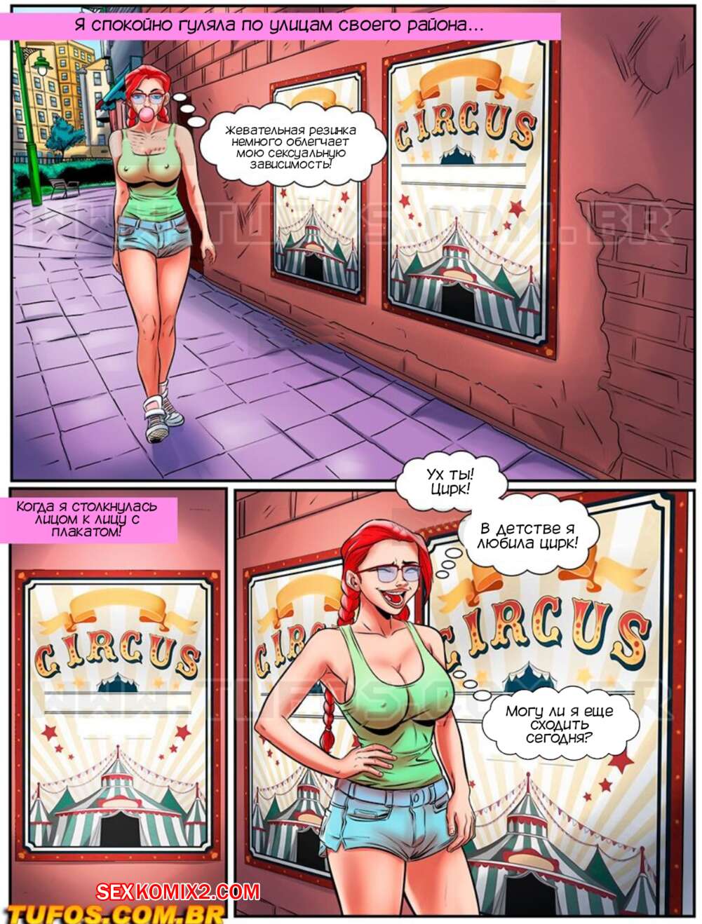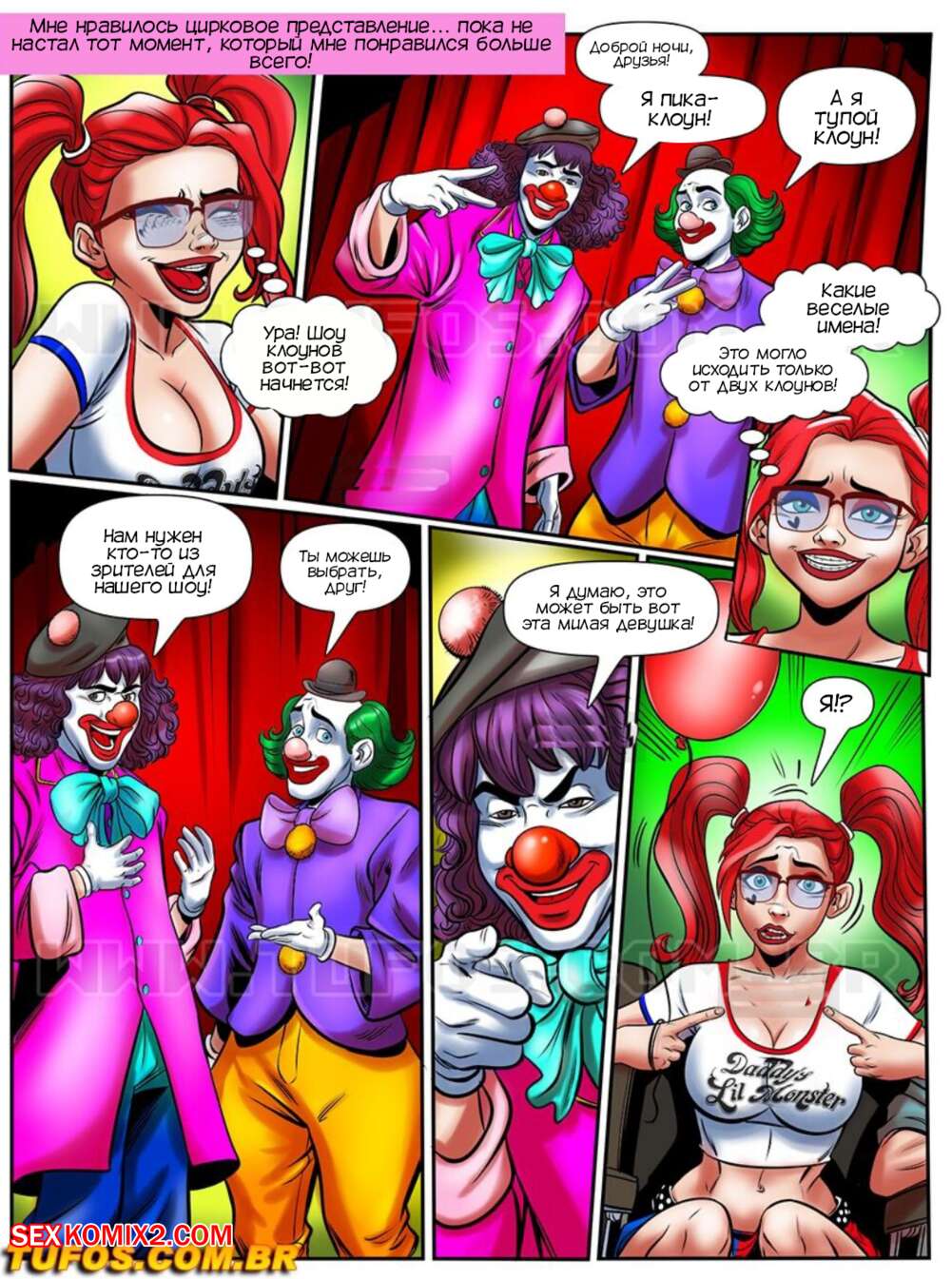Порно комикс Нимфоманка ботаник. Часть 16. A Nerd Ninfomanca. Tufos Горячая красотка Эмма отправилась в цирк и оказалась на сеансе только для взрослых. Клоуны вызвали девушку на сцену и дали ей отсосать свой большие хуи, после чего выебали девушку во все дырочки.