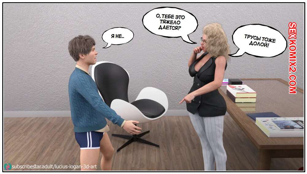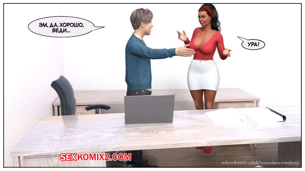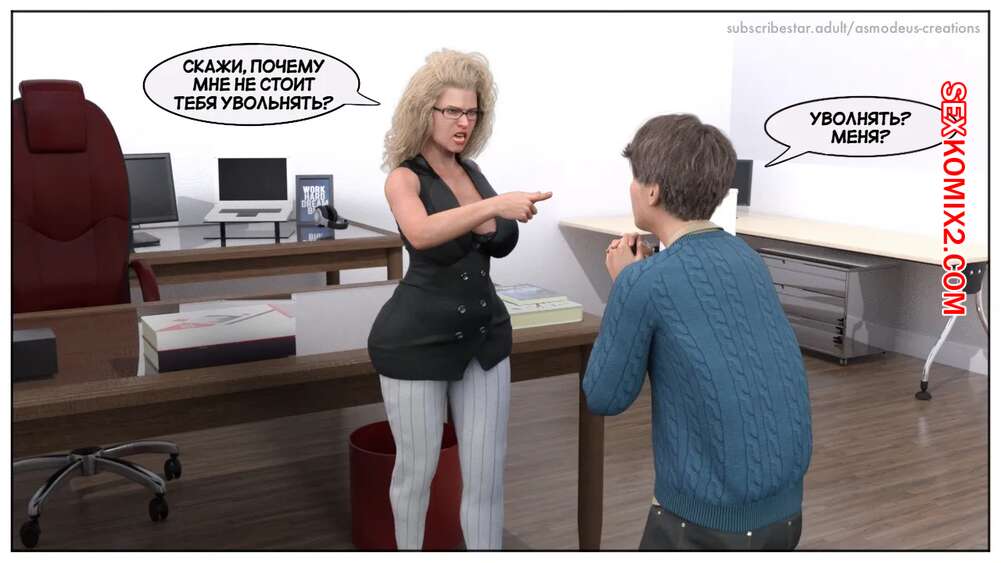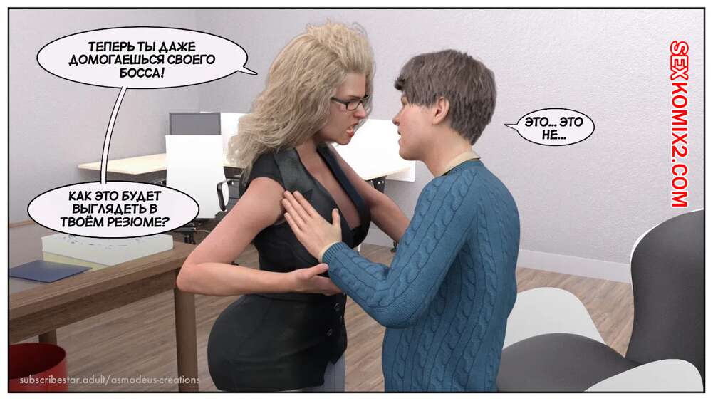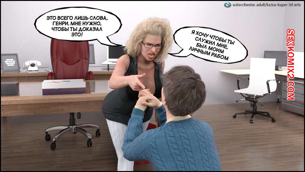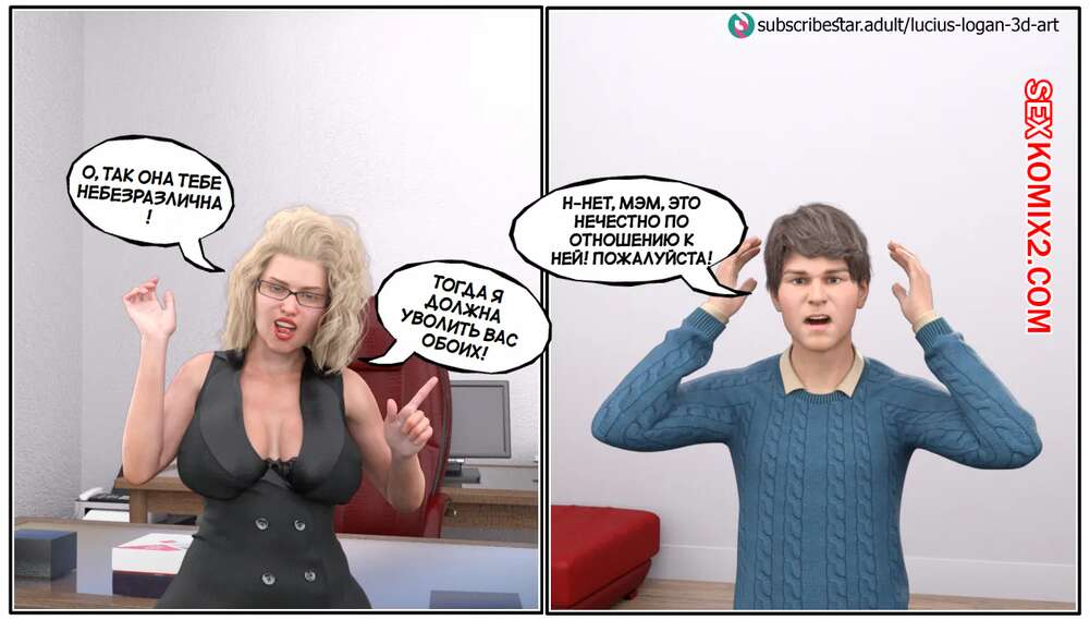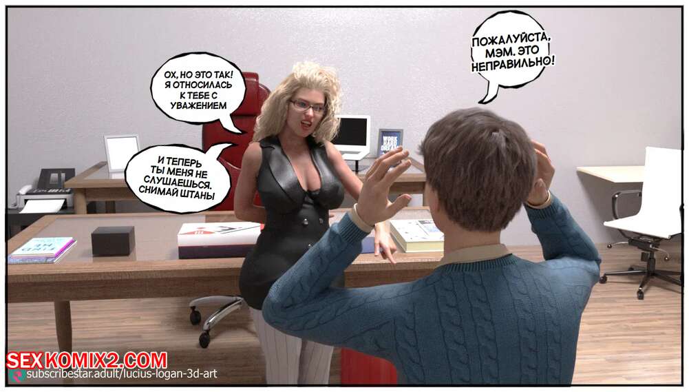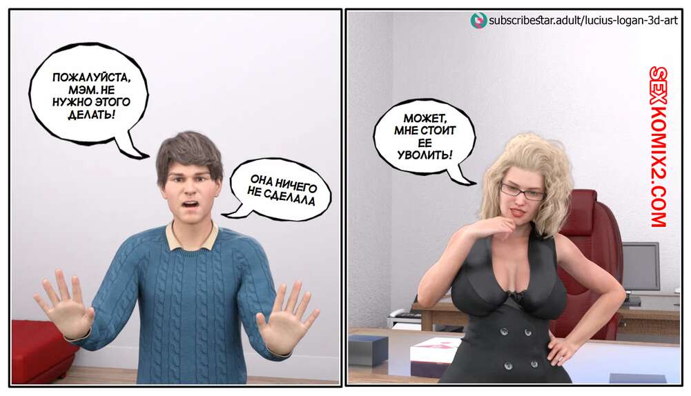 Порно комикс Моя новая работа. Часть 2. My New Job. Lucius Logan Сисястая блондинка милфа стала подозревать своего нового сотрудника в нарушении правил офиса и вызвала его к себе. Красотка собиралась уволить парня, но он стал умолять ее не делать этого.