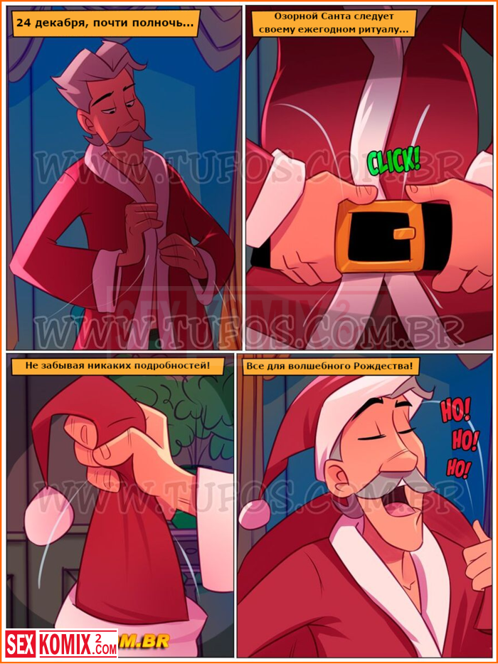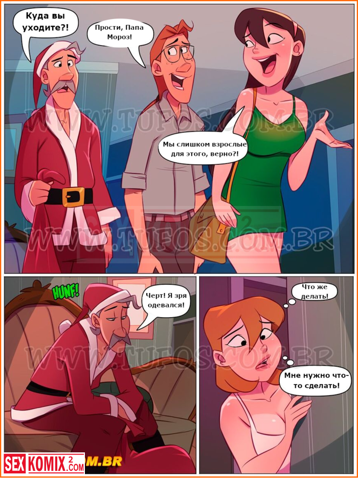 Порно комикс Похотливая семейка. Часть 95. Мешок Санты. Карлос оделся в костюм Санты, чтобы поздравить свою семью, но Карлитос и Анина ушли отмечать новый год у своих друзей. Отец расстроился, чтобы его утешить Мария одела костюм развратной снегурочки и поздравила своего мужа.