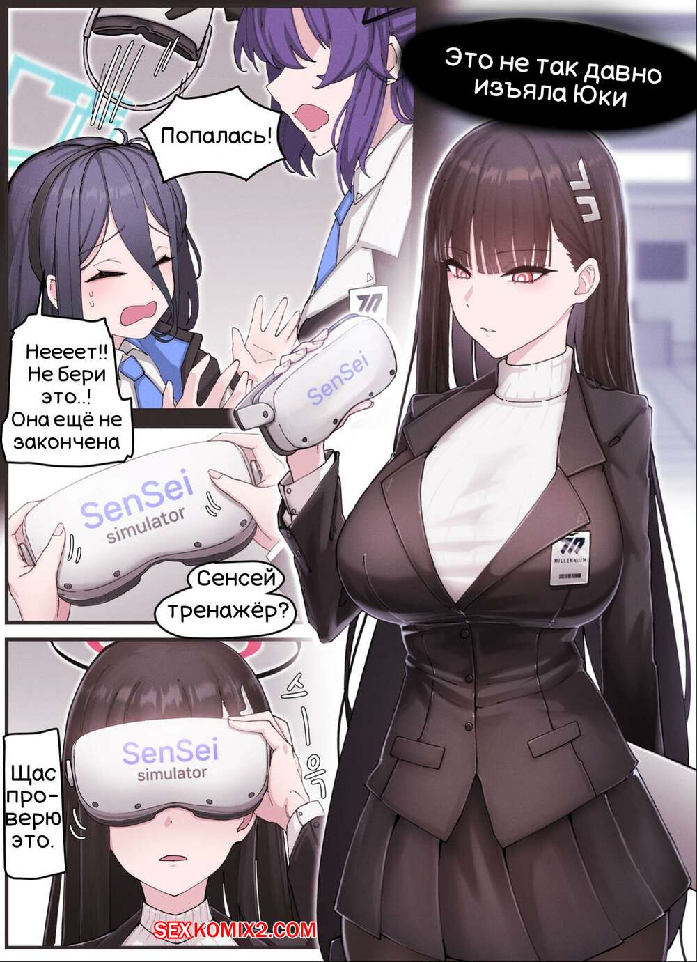 Порно комикс Blue Archive. Симулятор сенсея. Horori Горячая брюнетка надела очки виртуальной реальности и оказалась в окружение нескольких парней. Они раздели девушку и дали ей отсосать свои большие хуи, после чего хорошенько ее выебали.