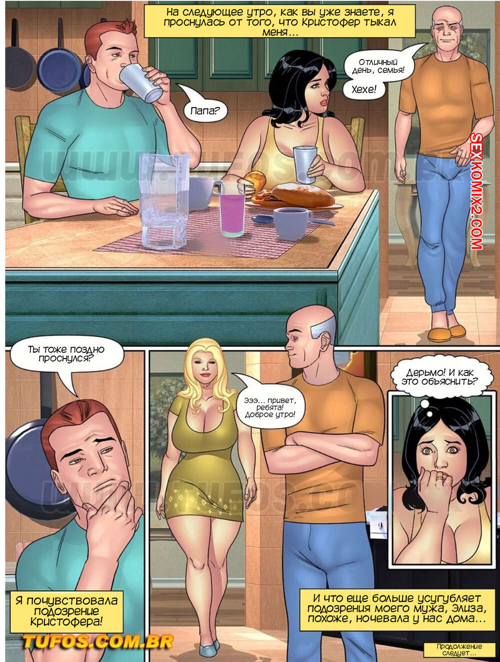 Порно комикс Папочка. Тесть извращенец. Часть 12. Tufos Клариса услышала ночью стоны и пошла проверить что там. Папито и Элиза обнаружили, как горячая брюнетка подглядывает за ними, так что в итоге все переросло в групповую еблю.