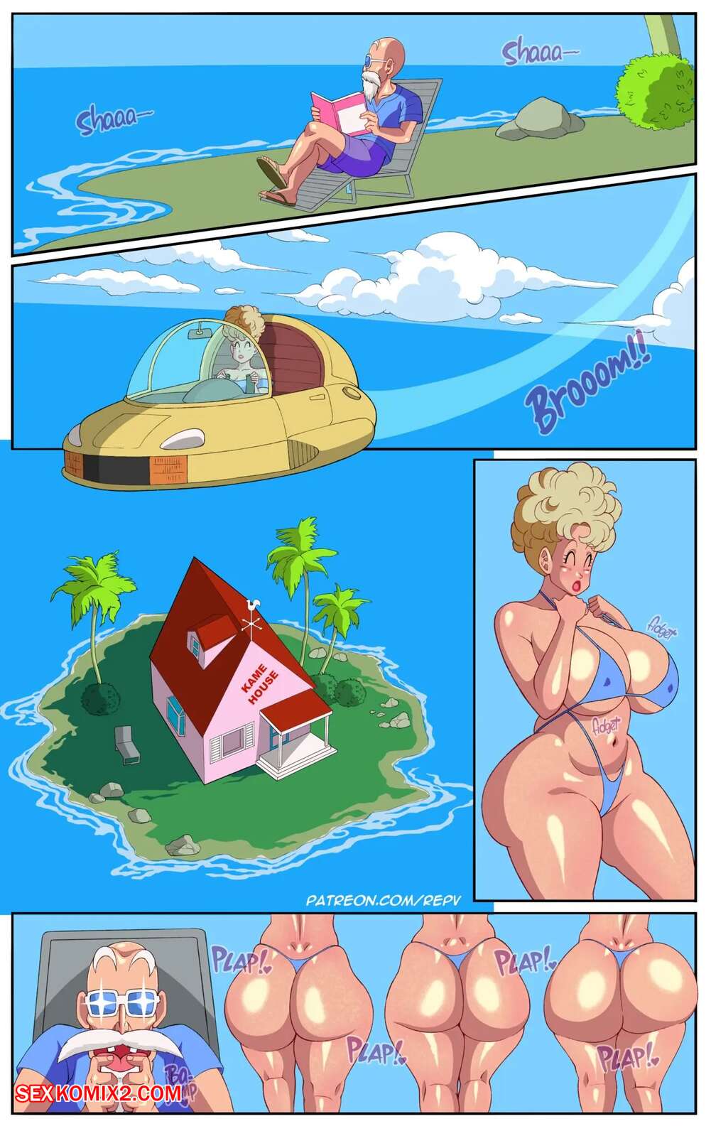 Порно комикс Dragon Ball. Камехаус приключения. KameHouse Adventure. Rony Горячая блондинка милфа пошла принять душ, а старик Роши решил воспользоваться моментом. Он разделся и пробрался в ванну к милфе, где стал лапать ее сиськи, возбуждая женщину.