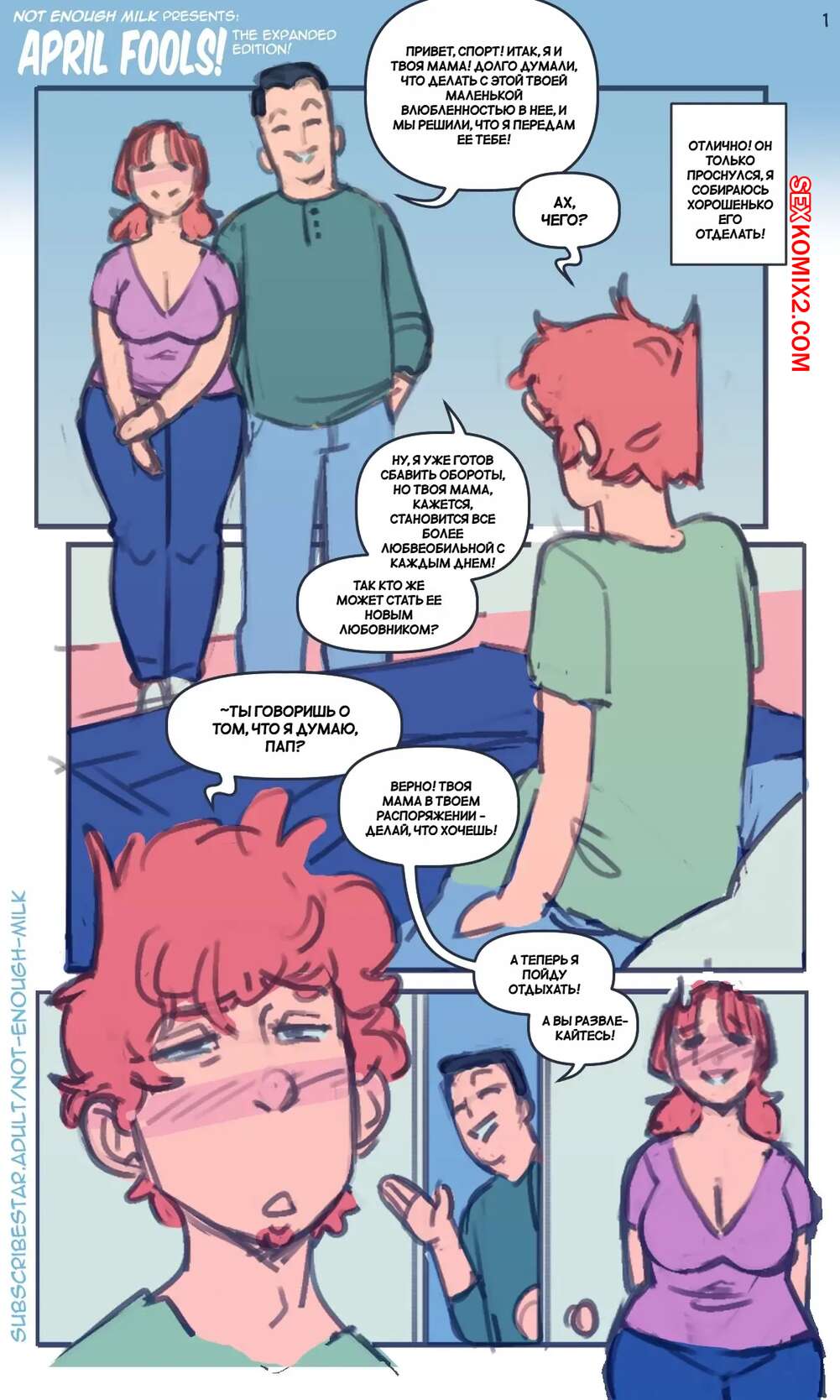 Порно комикс Апрельские шутки. April fools. NotEnoughMilk Горячая рыжая милфа была очень возбуждена и решила повеселиться со своим сыном. Красотка отсосала большой хуй парня, после чего дала ему себя хорошенько выебать.
