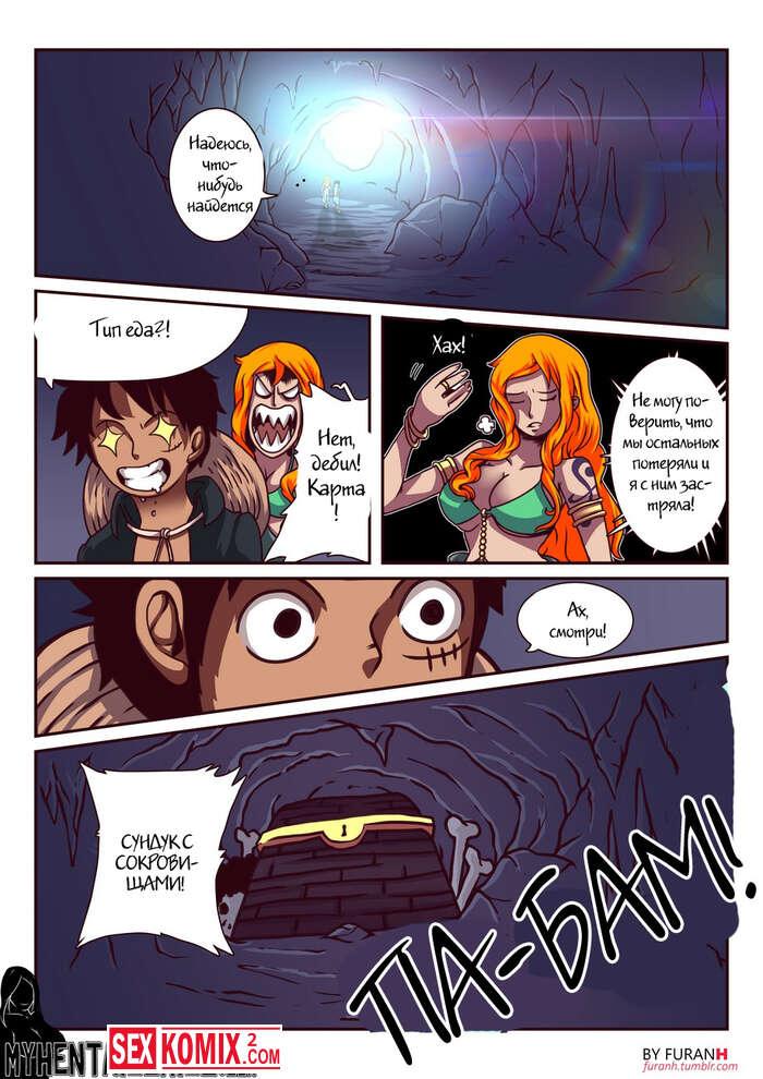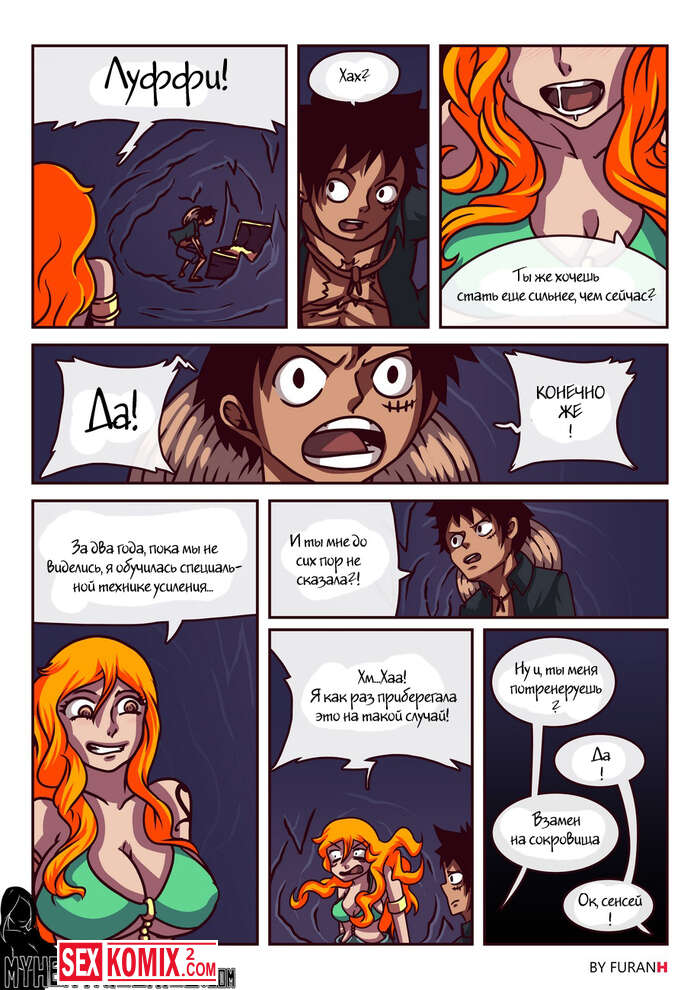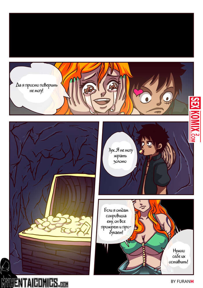 Порно комикс One Piece. Золотая тренировка. Рыжая пиратка со своим капитаном нашли сундук с сокровищами. Парень предложил свою доле, если девушка даст её выебать.