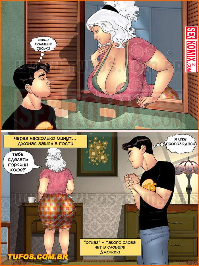 Порно комикс Тетя, кузины и племянник. Часть 22. Соседские сплетни. Джонас пошел на рынок купить мясо к обеду. Но его остановила пожилая соседка, она пригласила его в гости и парень подумал, что женщина хочет трахаться. Но она хотела услышать сплетни о его семье.