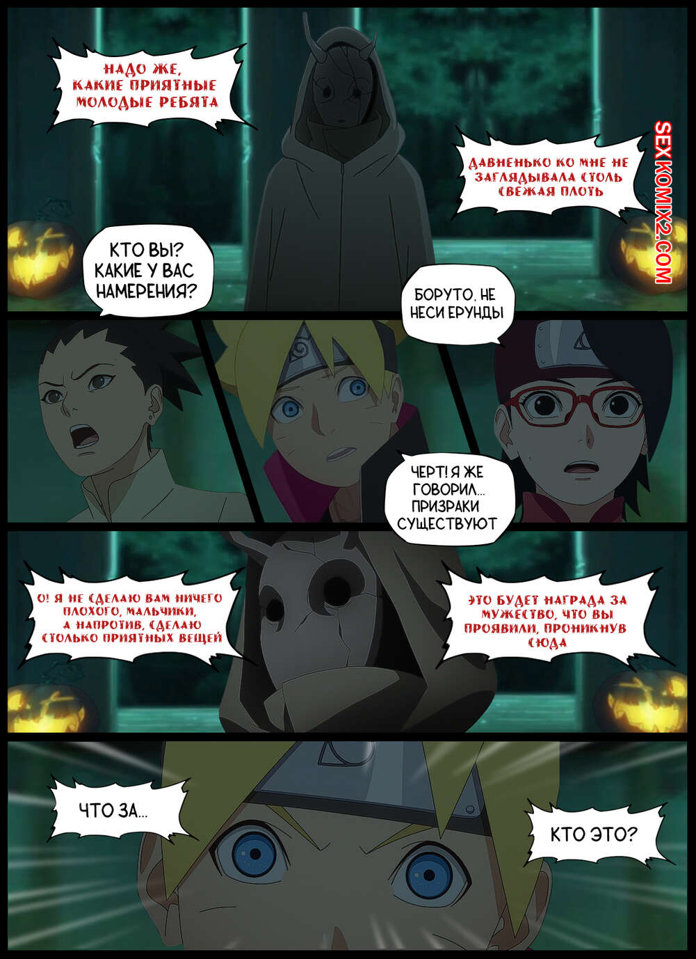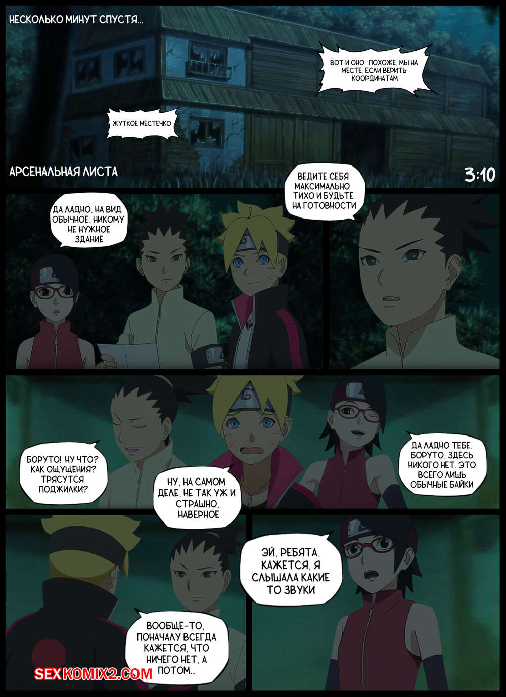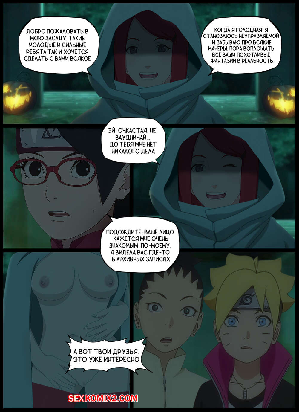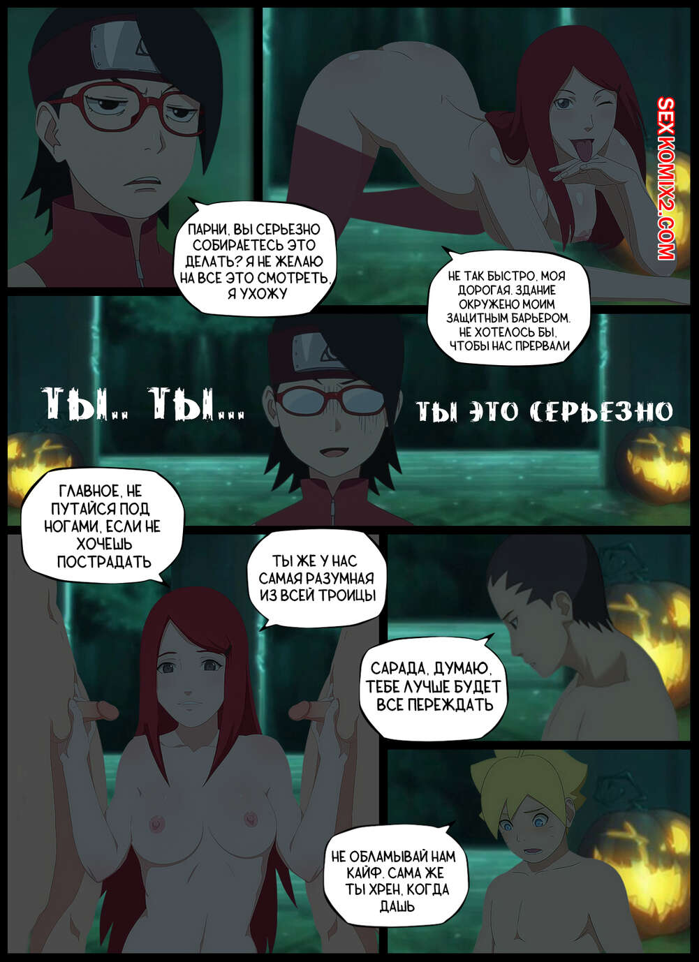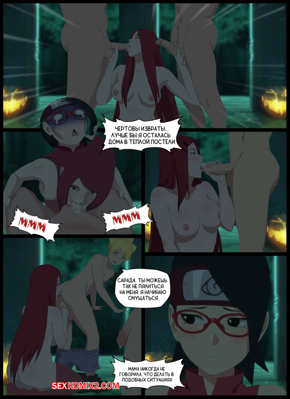 Порно комикс Наруто. Приятная Засада. A Pleasant Ambush. KristoLin Боруто, Шикадай и Сарада пробираются в таинственную заброшку, где парням выпал шанс выебать с Кушину Узумаки, пока Сарада будет в отключке. Милфа отсосала хуи парней, после чего дала им выебать все свои дырочки.
