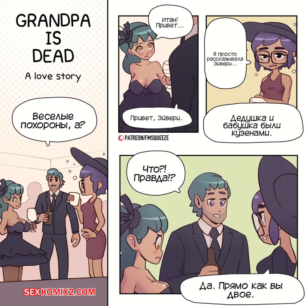 Порно комикс Дедушка умер. История любви. Grandpa is Dead. A Love Story. Fmsqueeze Парень с девушкой выпили на похоронах своего дедушки и сильно возбудились. Девушка разделась и отсосала хуй своего кузена, после чего дала ему выебать свою пизденку и кончить в нее.