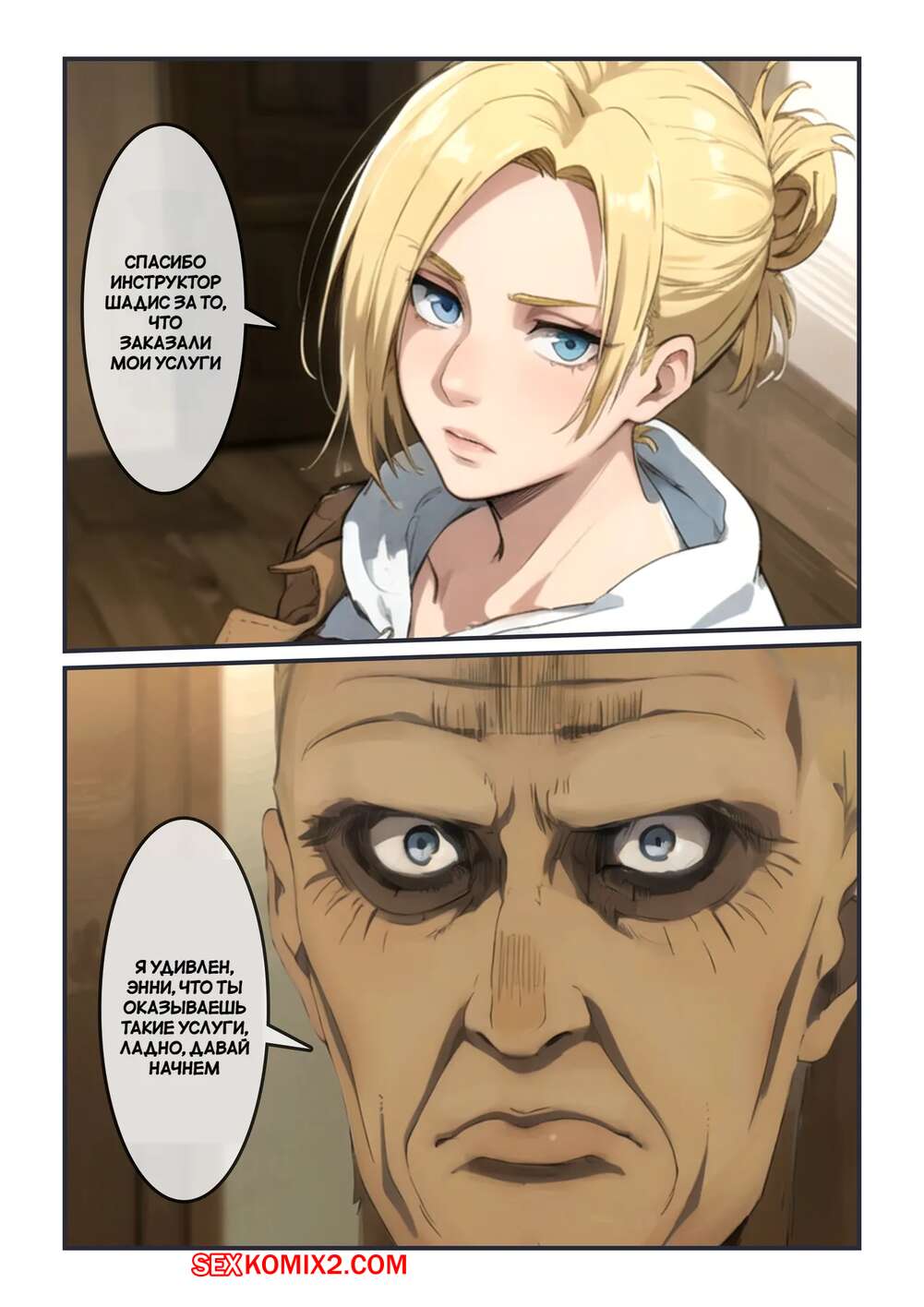 Порно комикс Атака Титанов. Сервис Энни. Annies Private Service. Kahoo Горячая блондинка Энни согласилась оказать свои услуги интруктору Шадасу. Красотка встала на колени и отсосала хуй старика, после чего дала ему себя выебать и кончить в нее.