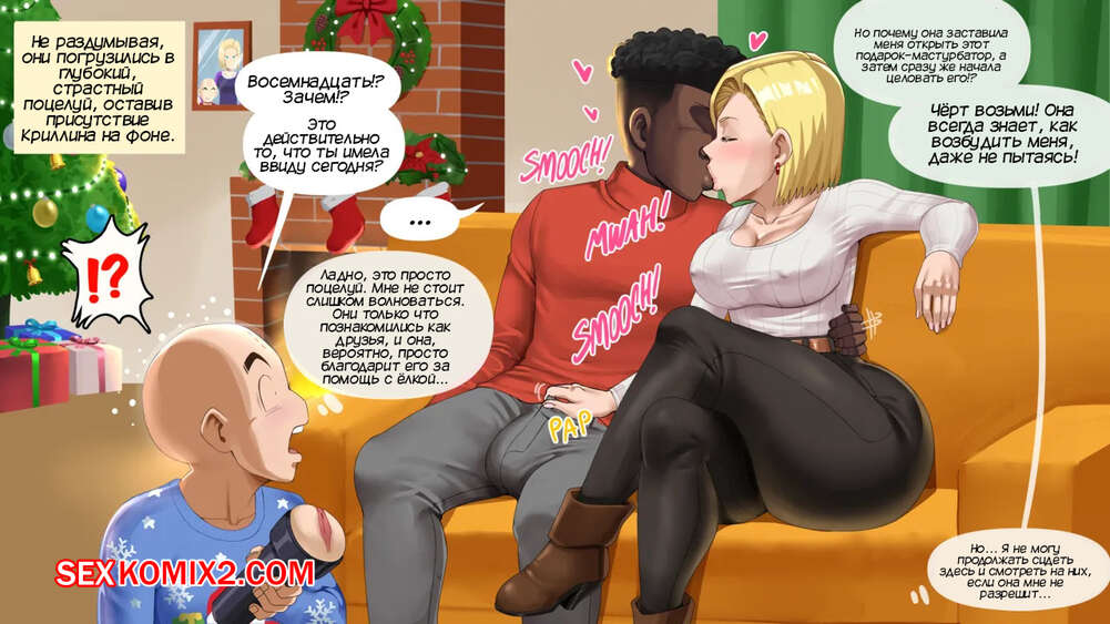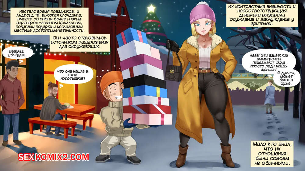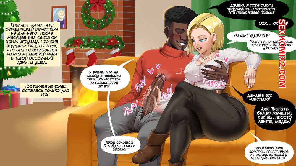 Порно комикс Dragon Ball. Рождество Андроид 18. PP Android 18 Christmas One Shot Во время прогулки по магазинам с Криллином Андроид 18 положила глаз на симпатичного темнокожего парня. Красотка попросила его им помочь с покупками, а дома соблазнила паренька и дала ему себя выебать.
