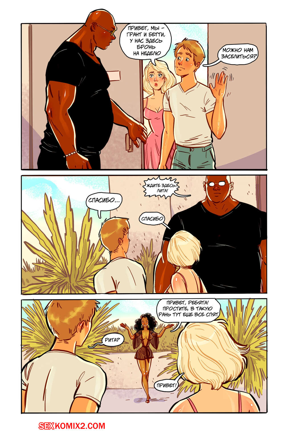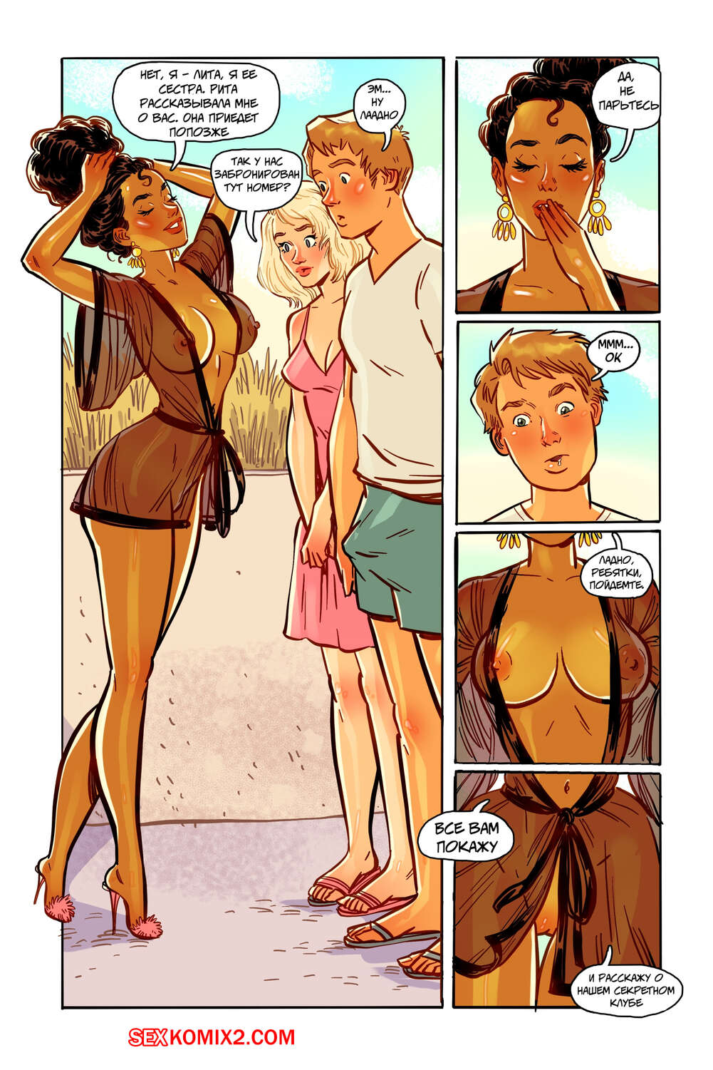 Порно комикс Волнующий остров. Земля удовольствий. Том 1. Глава 1. Andrew Tarusov Грант и Бетти отправились в путешествие и приехали на особенный курорт, где процветает свингерство. Парочка отправилась на пляж, чтобы потрахаться, но они привлекли внимание прохожих парней, которые тоже хотят почувствовать ротик блондиночки.