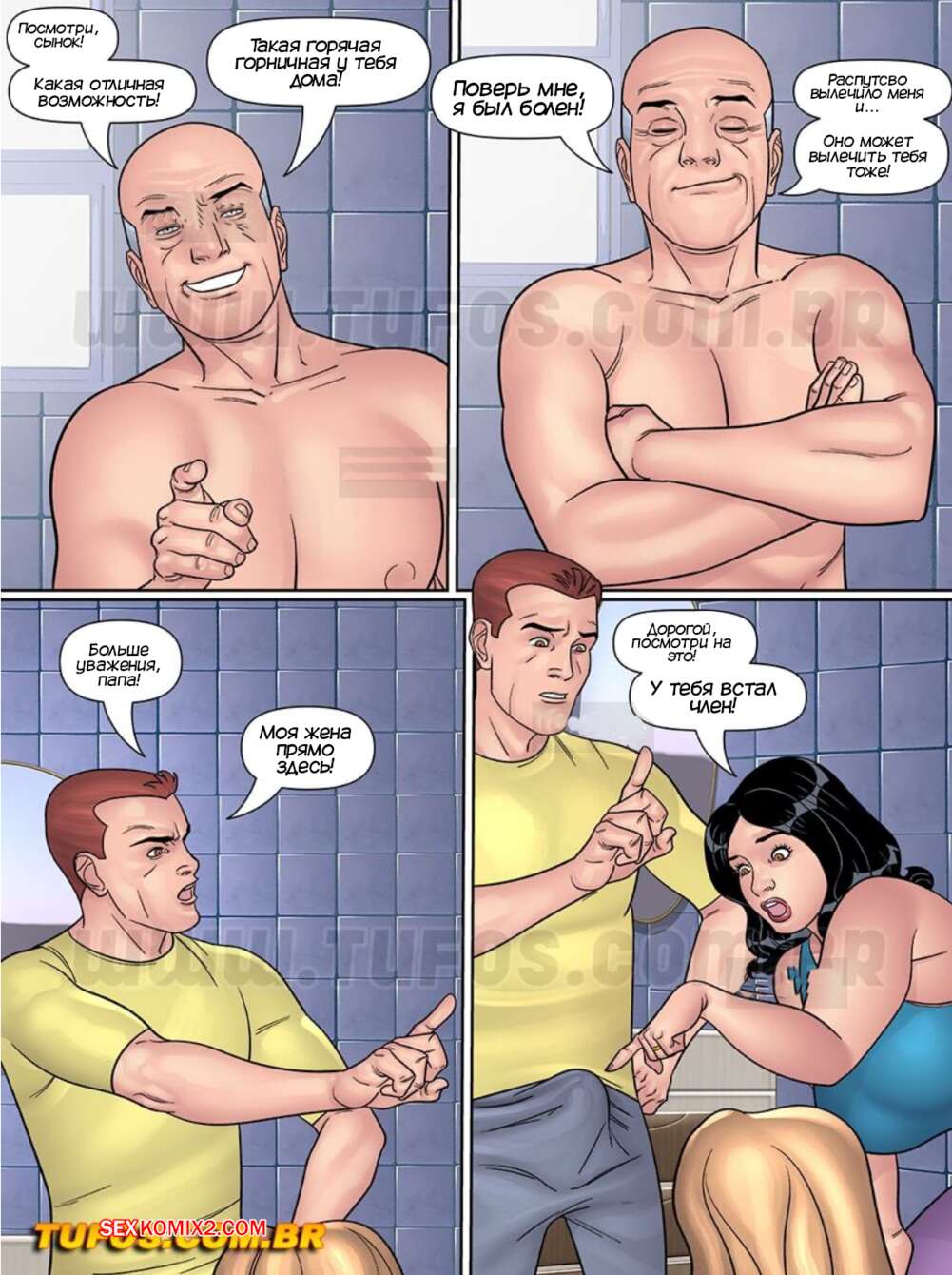 Порно комикс Папочка. Тесть извращенец. Часть 16. Tufos Кристофер застал своего за еблей с Селеной, но старик убедил сына расслабиться. Вскоре к ним присоединилась Кларисса и они отправились в спальню, чтобы заняться групповой еблей.