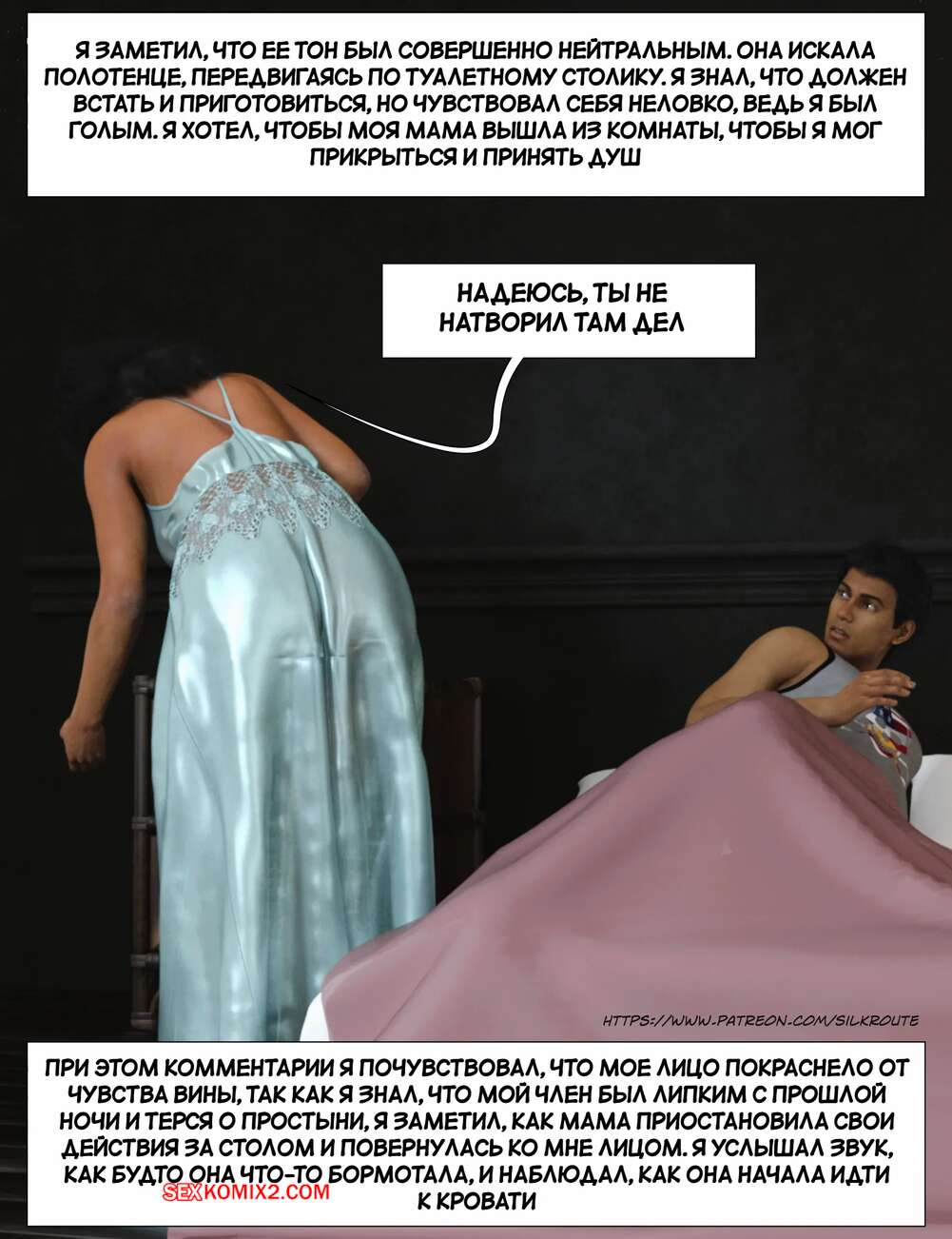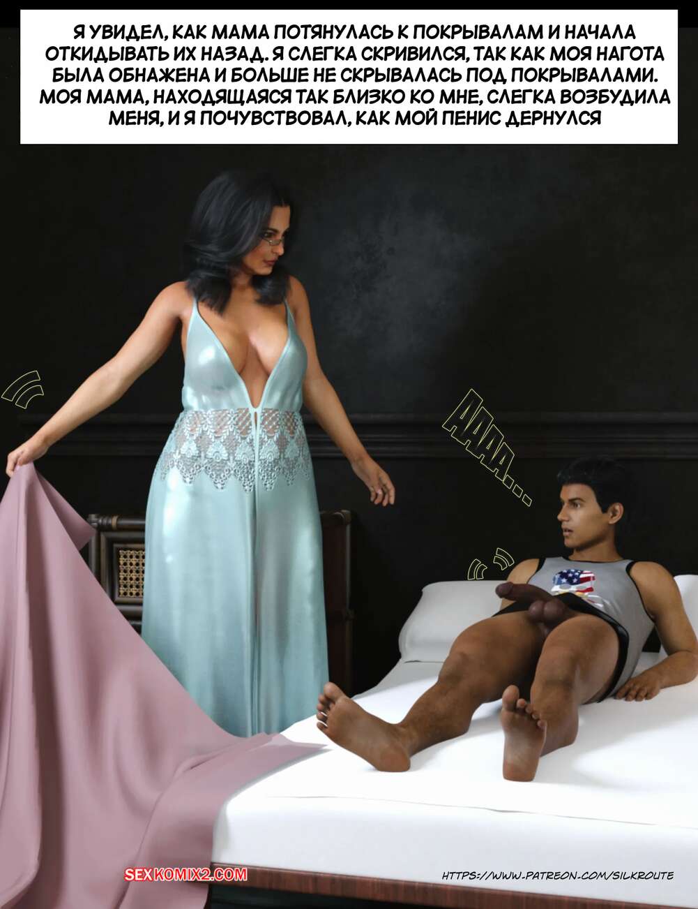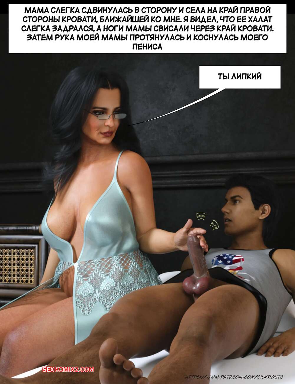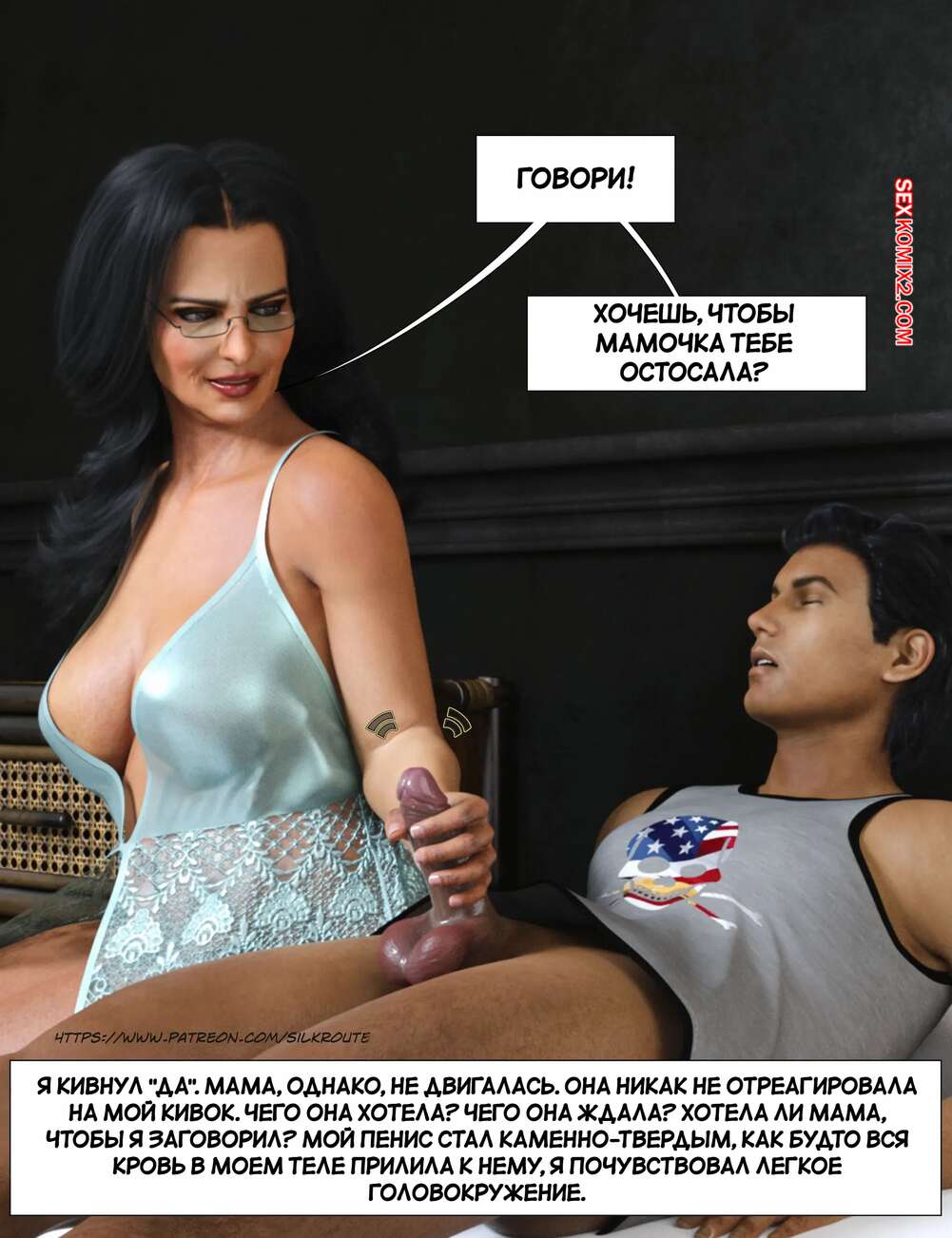 Порно комикс Прошу, помоги мне расслабиться. Часть 6. Please Relieve Me. Silk Route, Ira Raman Горячая милфа продолжает помогать своему сыну снимать напряжение. Она пришла ночью в комнату парня и возбудила его шикарным телом, после чего оседлала хуй сына и дала себя выебать.