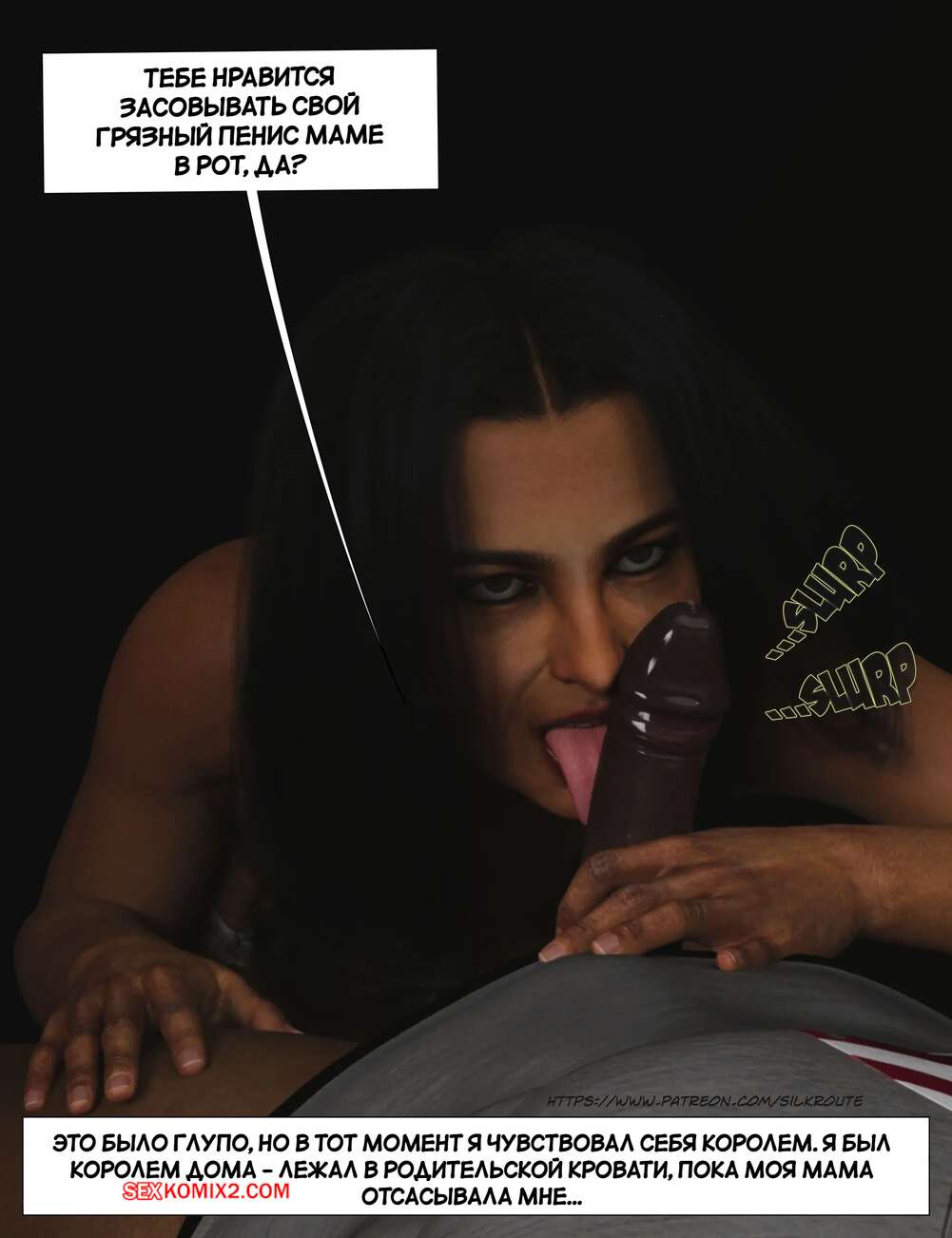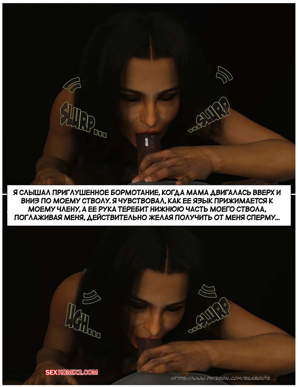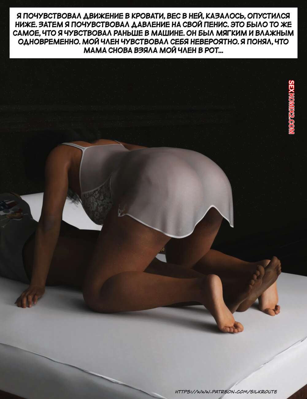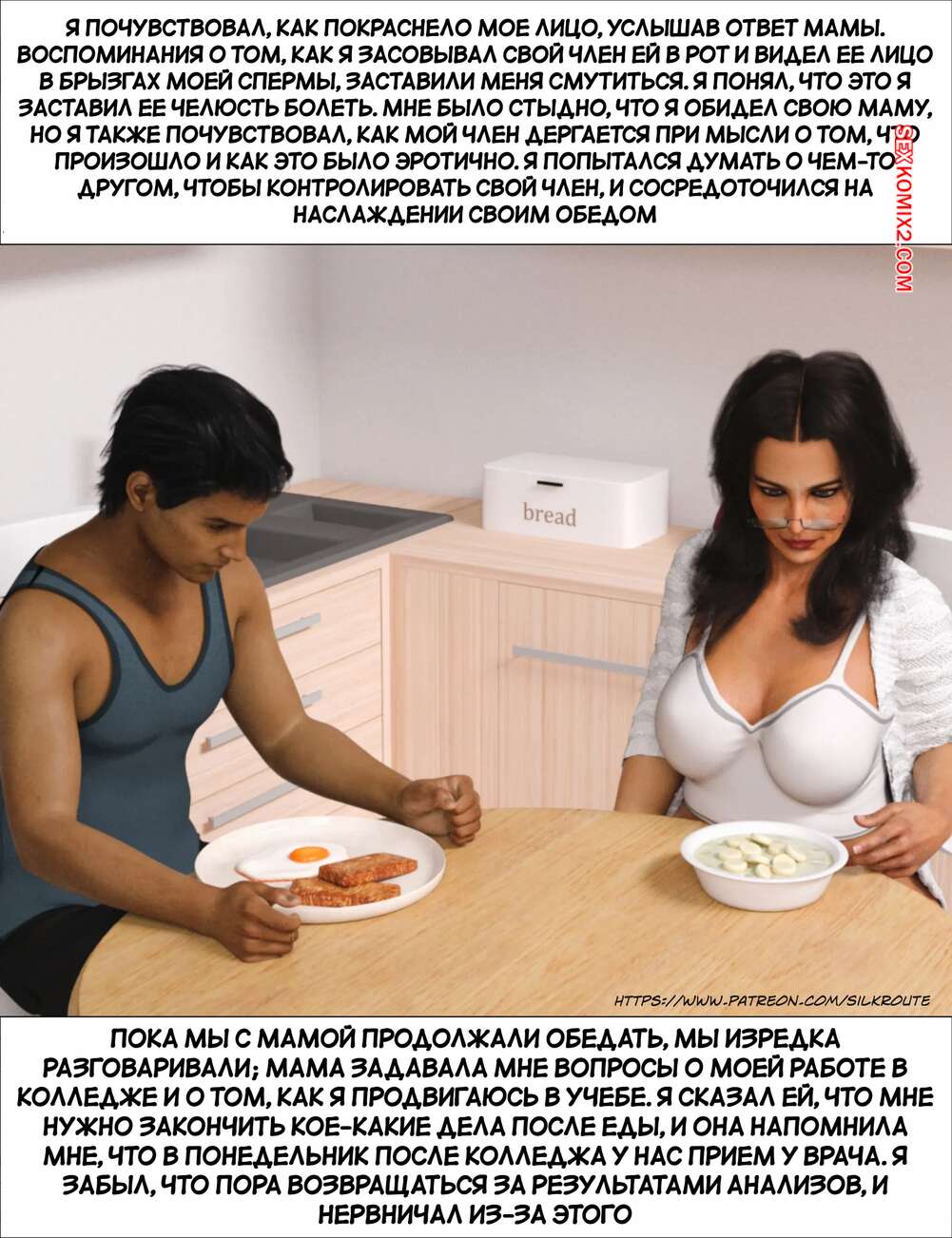Порно комикс Прошу, помоги мне расслабиться. Часть 6. Please Relieve Me. Silk Route, Ira Raman Горячая милфа продолжает помогать своему сыну снимать напряжение. Она пришла ночью в комнату парня и возбудила его шикарным телом, после чего оседлала хуй сына и дала себя выебать.