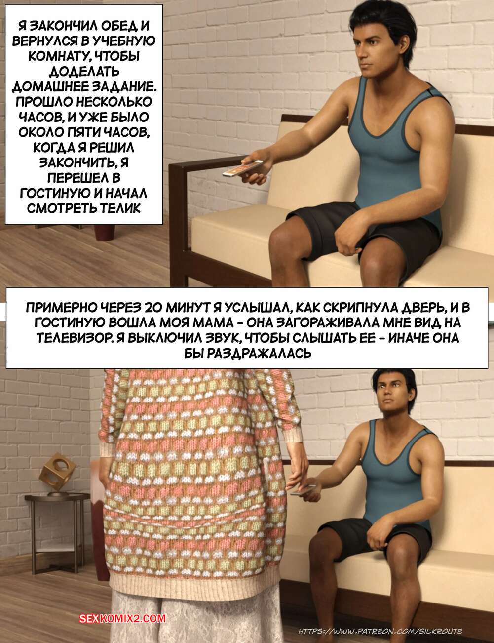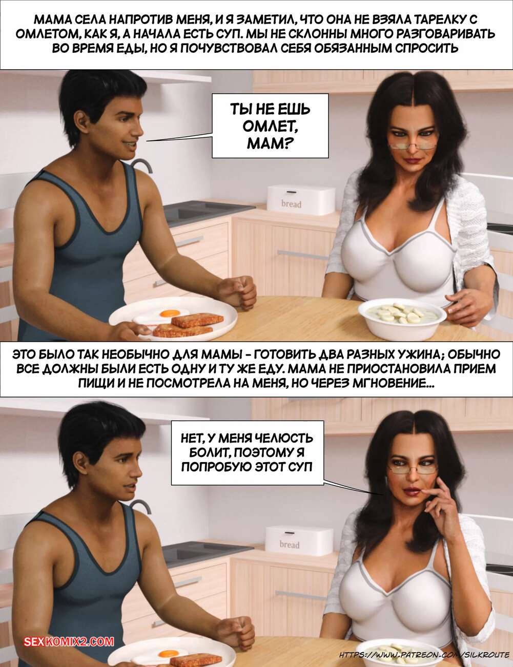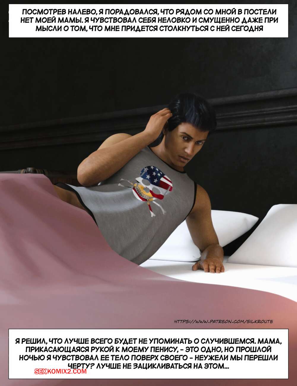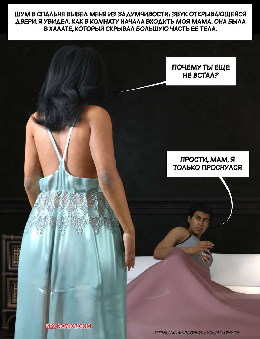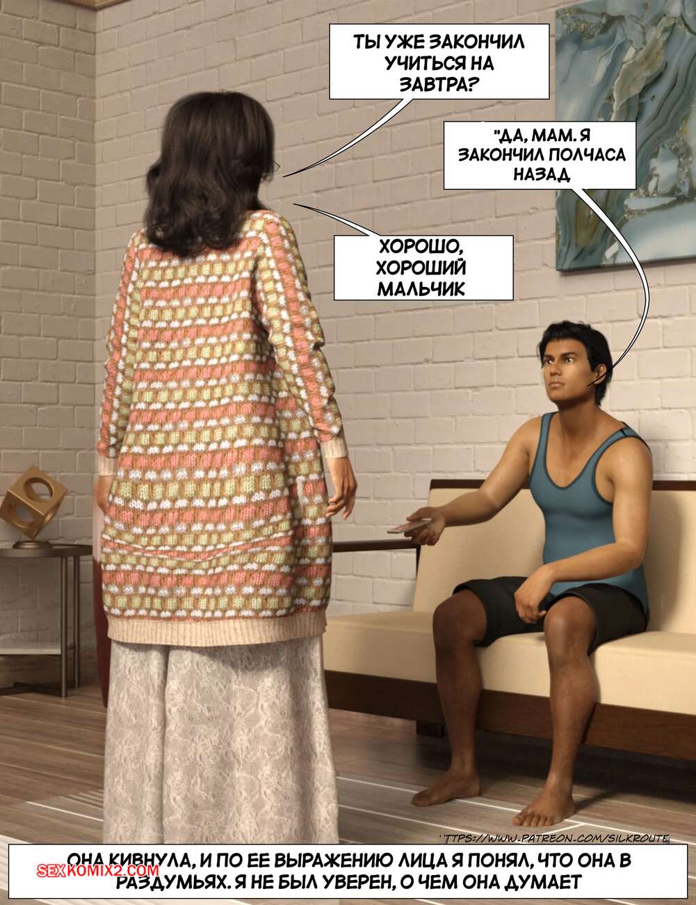 Порно комикс Прошу, помоги мне расслабиться. Часть 6. Please Relieve Me. Silk Route, Ira Raman Горячая милфа продолжает помогать своему сыну снимать напряжение. Она пришла ночью в комнату парня и возбудила его шикарным телом, после чего оседлала хуй сына и дала себя выебать.