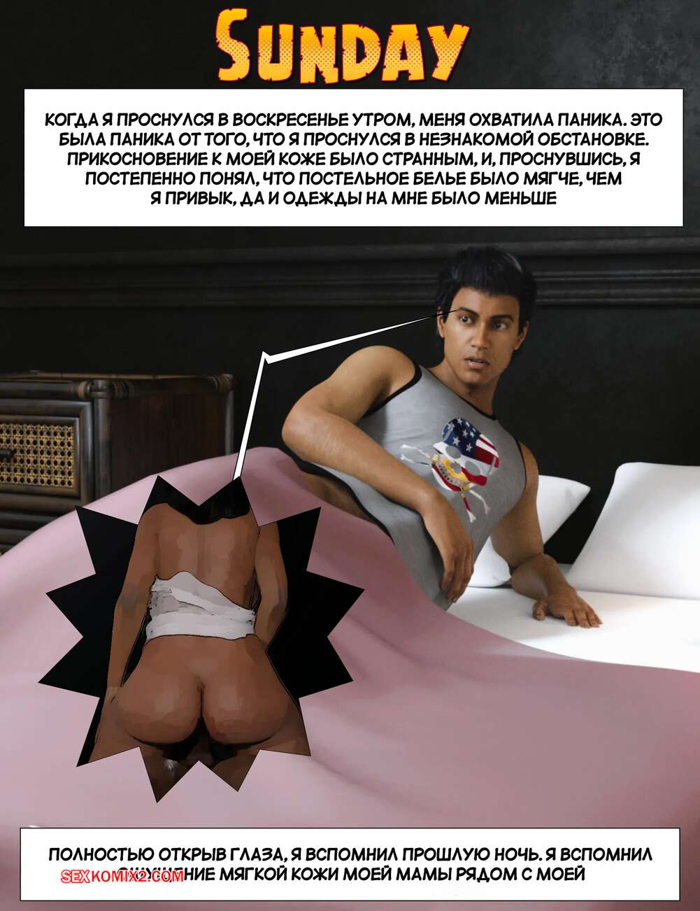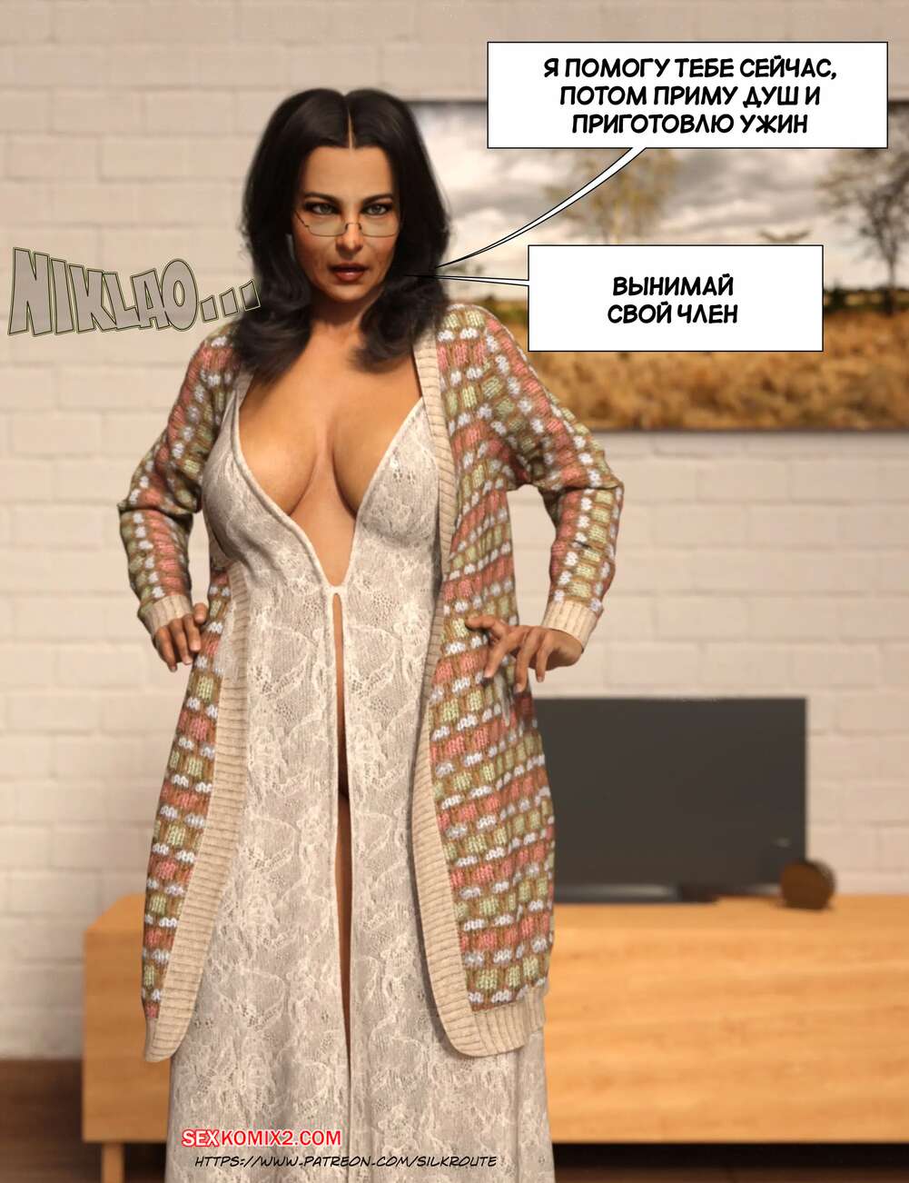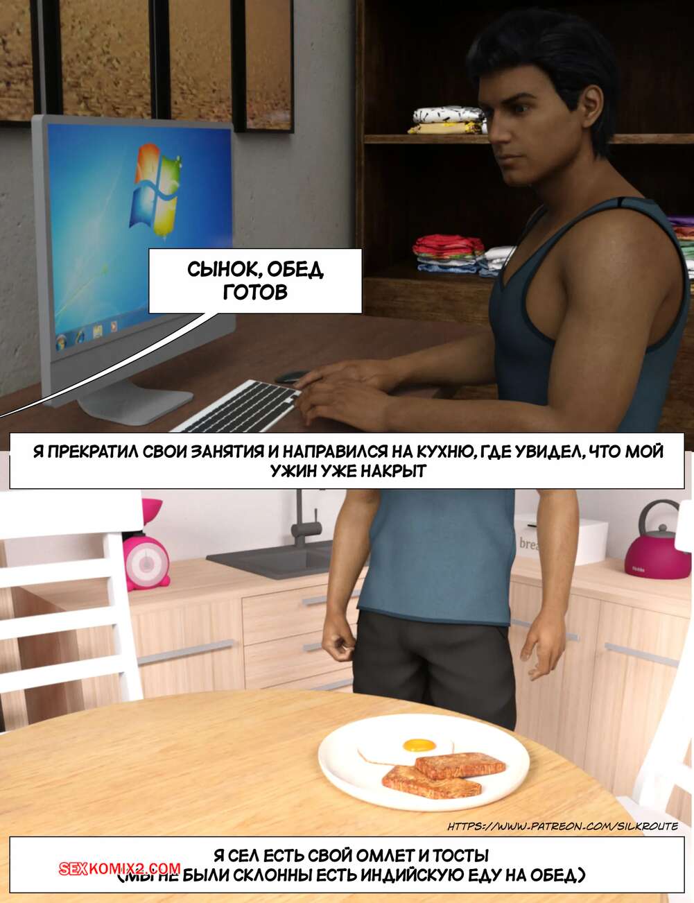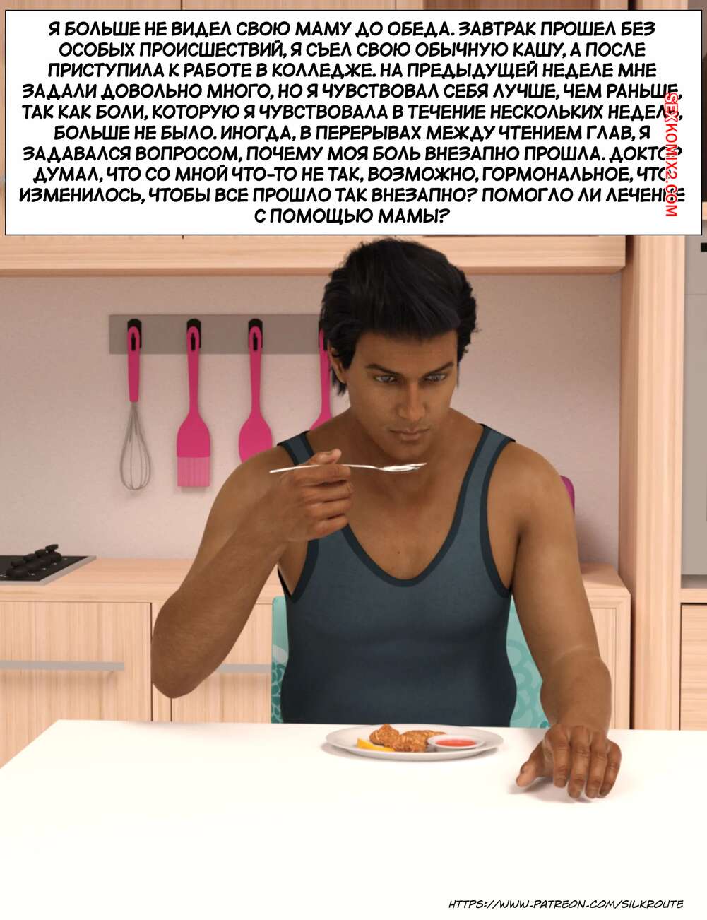 Порно комикс Прошу, помоги мне расслабиться. Часть 6. Please Relieve Me. Silk Route, Ira Raman Горячая милфа продолжает помогать своему сыну снимать напряжение. Она пришла ночью в комнату парня и возбудила его шикарным телом, после чего оседлала хуй сына и дала себя выебать.