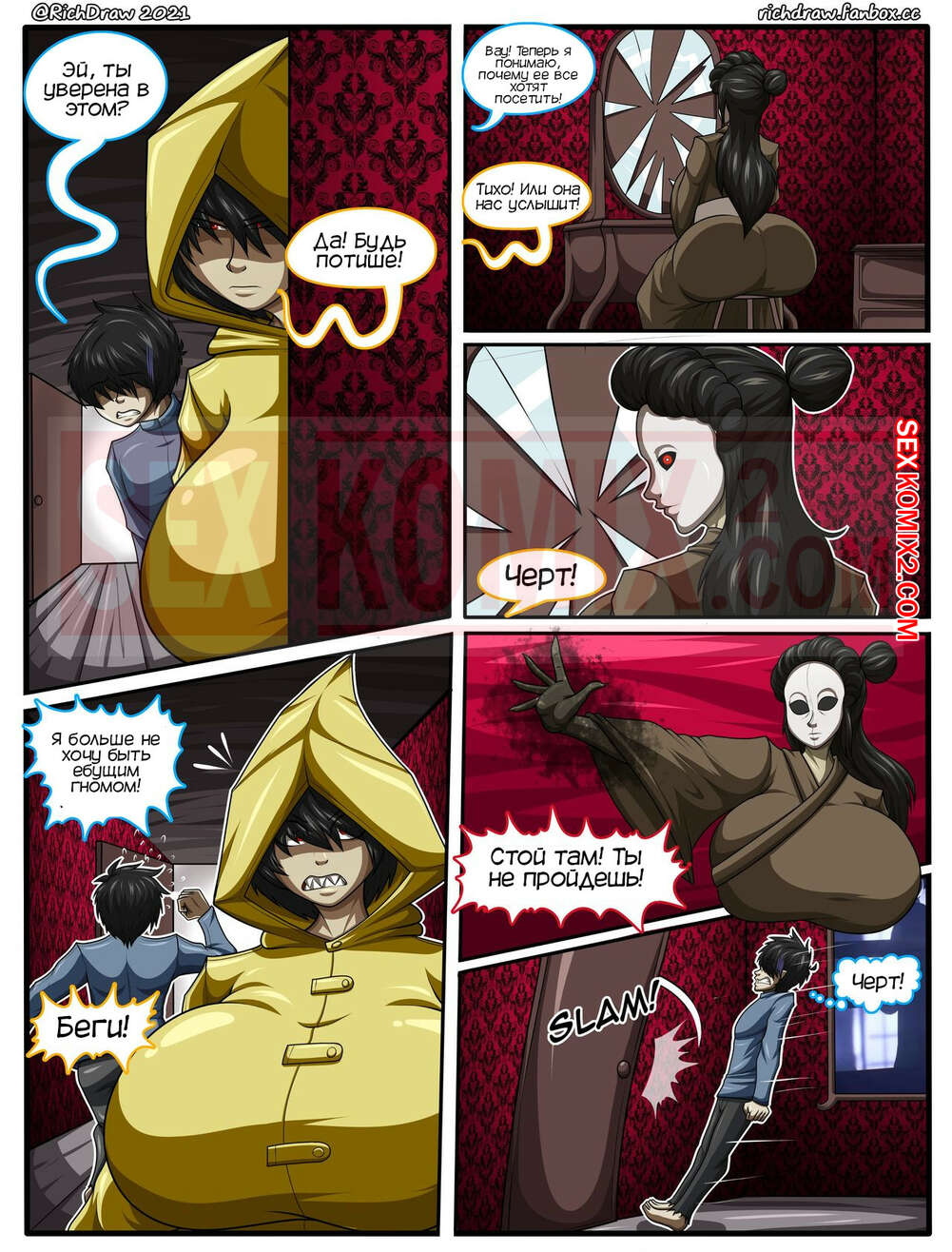 Порно комикс Мой непристойный кошмар. RichDraw. Девушка в желтом костюме очень проголодалась по пенису, и поэтому, встретив странное существо с огромным членом, она не сдержалась и тогда просто проглотила весь его член своим ртом, а потом засунула в пизду, чтобы отличного траха.