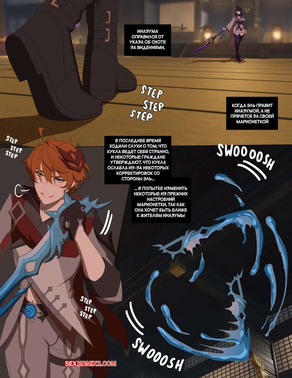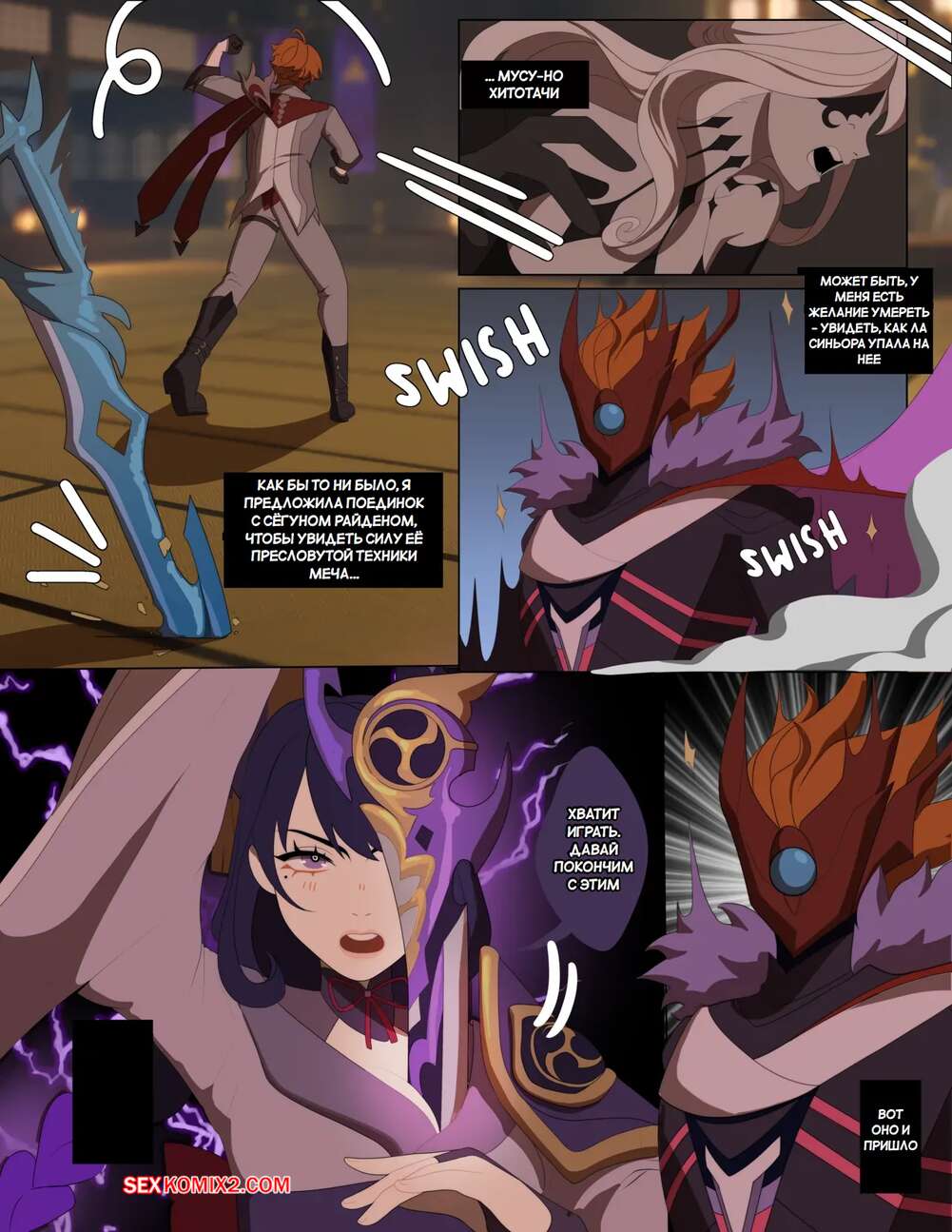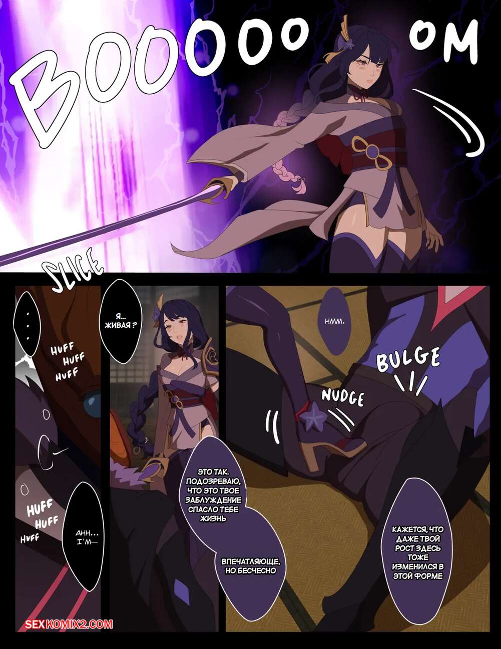 Порно комикс Genshin Impact. Дуэль против Сегуна Райдена. Creamboyo Злодей одолел горячую брюнетку и решил насладиться ее шикарным телом. Он снял с нее одежду, после чего вставил в нее свой большой хуй и хорошенько выебал ее пизденку.