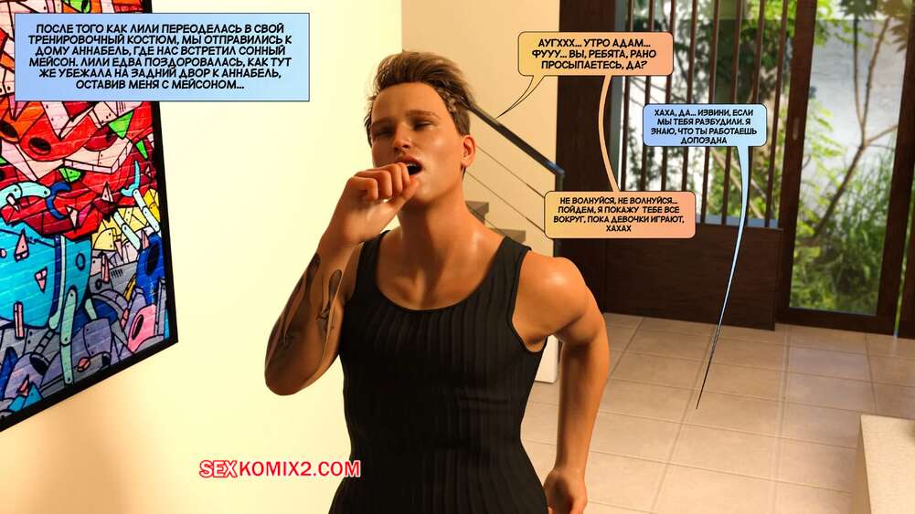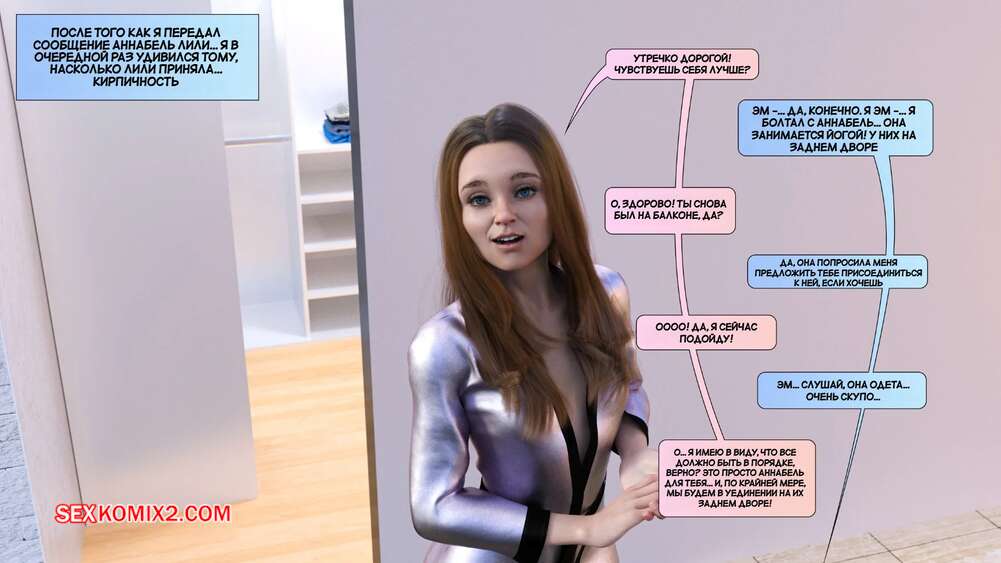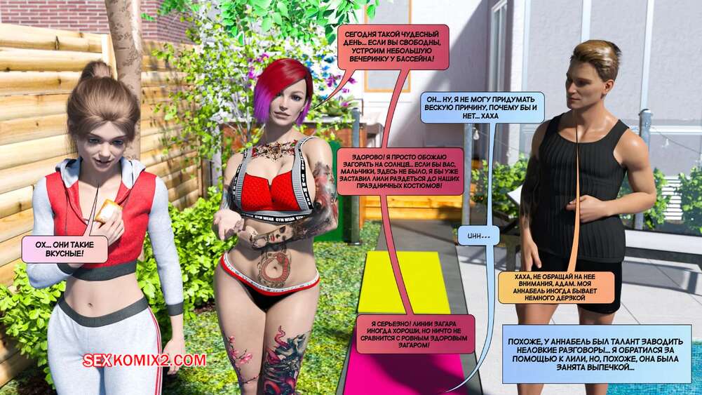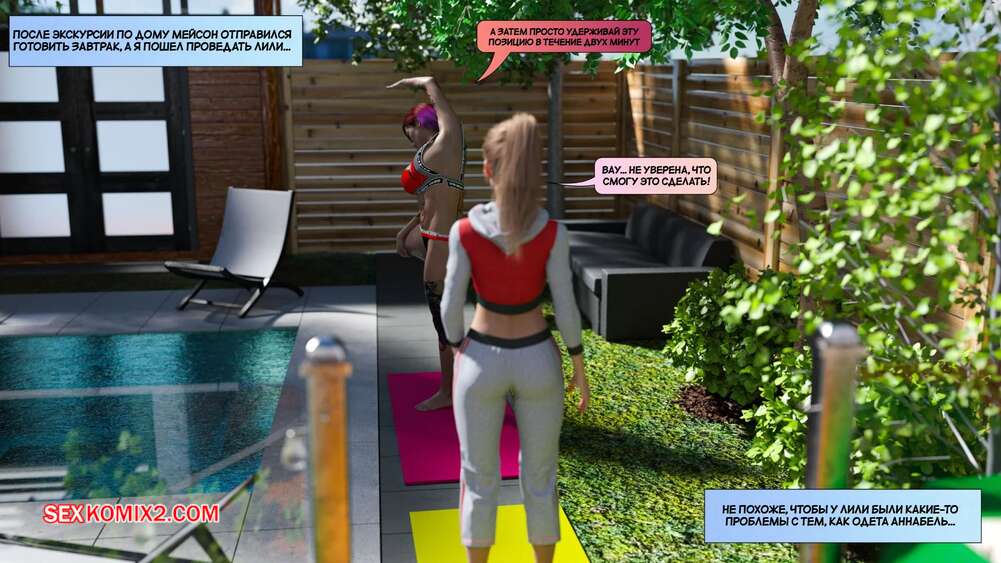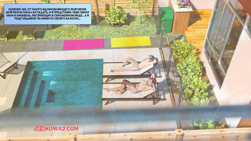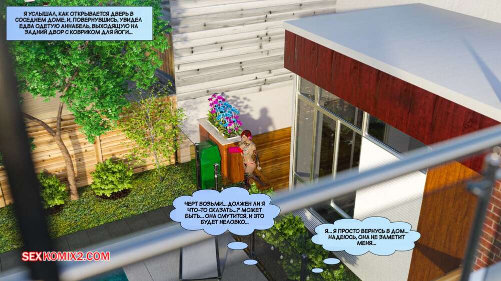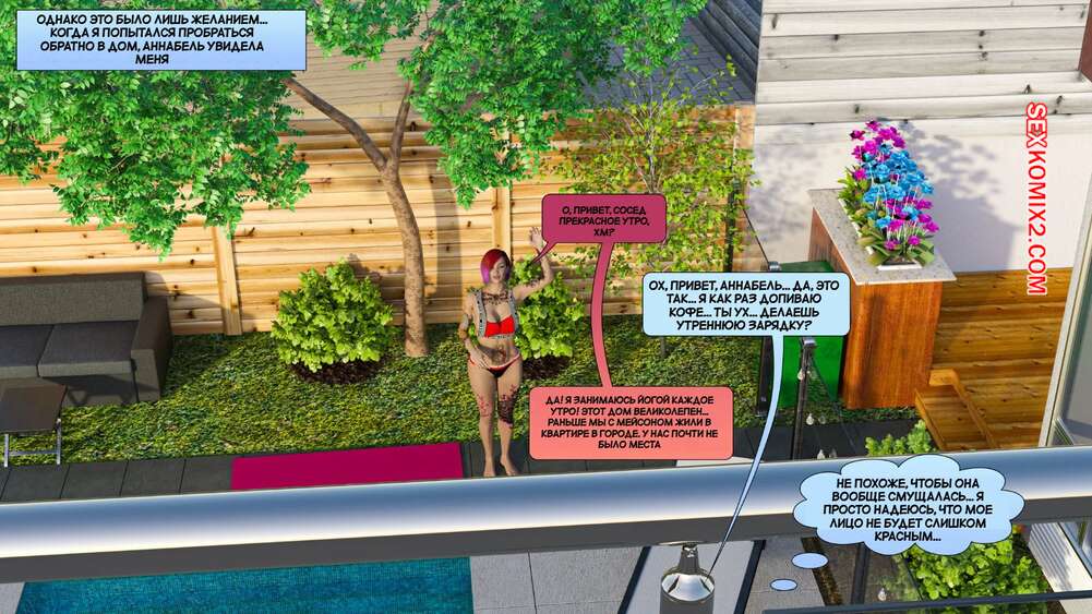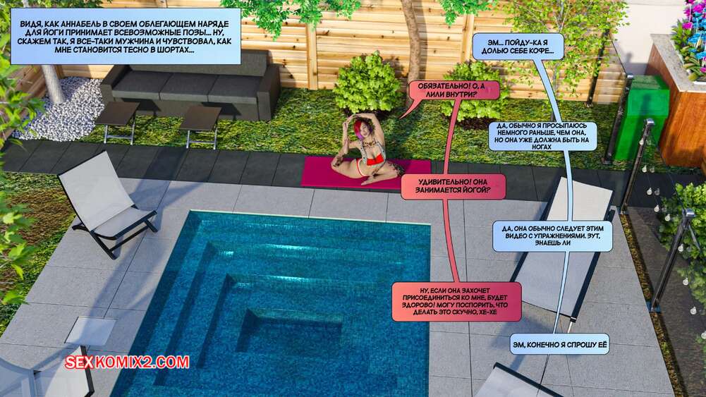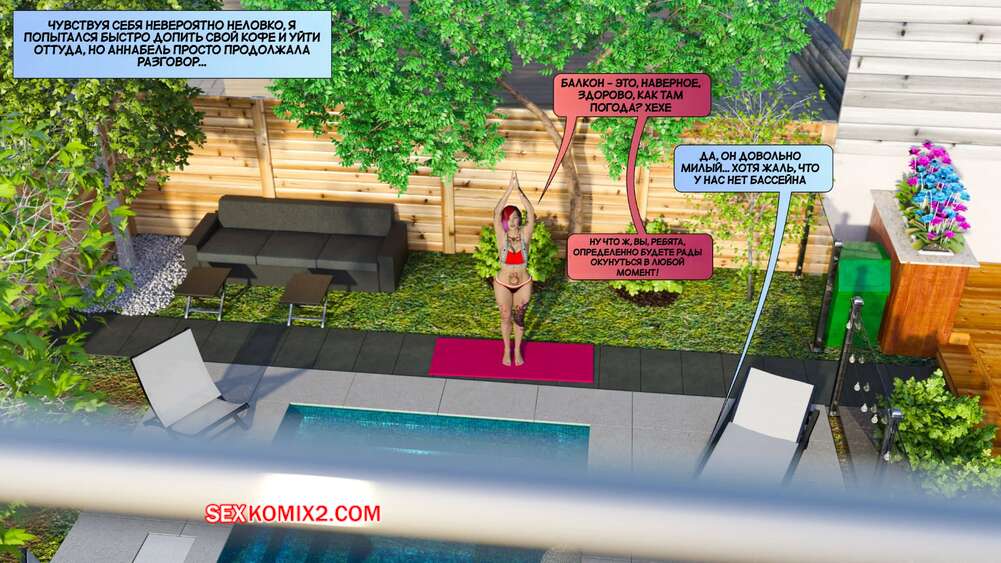 Порно комикс Новые соседи. Часть 2. The New Neighbors. Antalore42 Горячая красотка вышла к бассейну, чтобы заняться йогой. Ее новый сосед стал наблюдать за девушкой с балкона, любуясь ее шикарным телом. Совсем скоро парень возбудился..