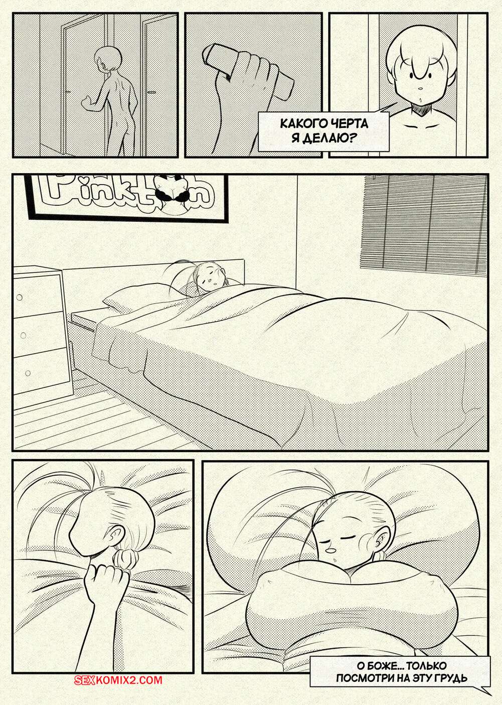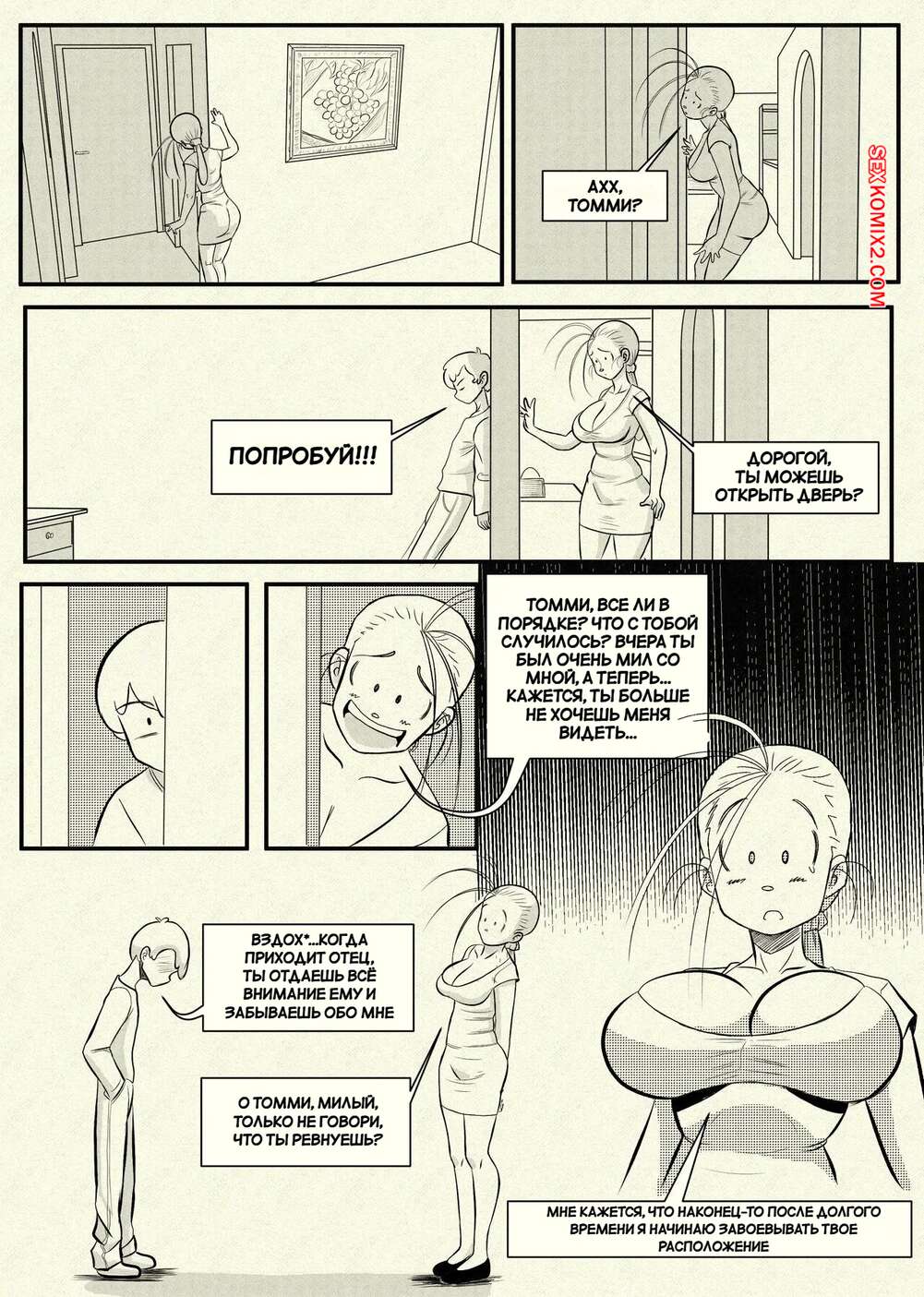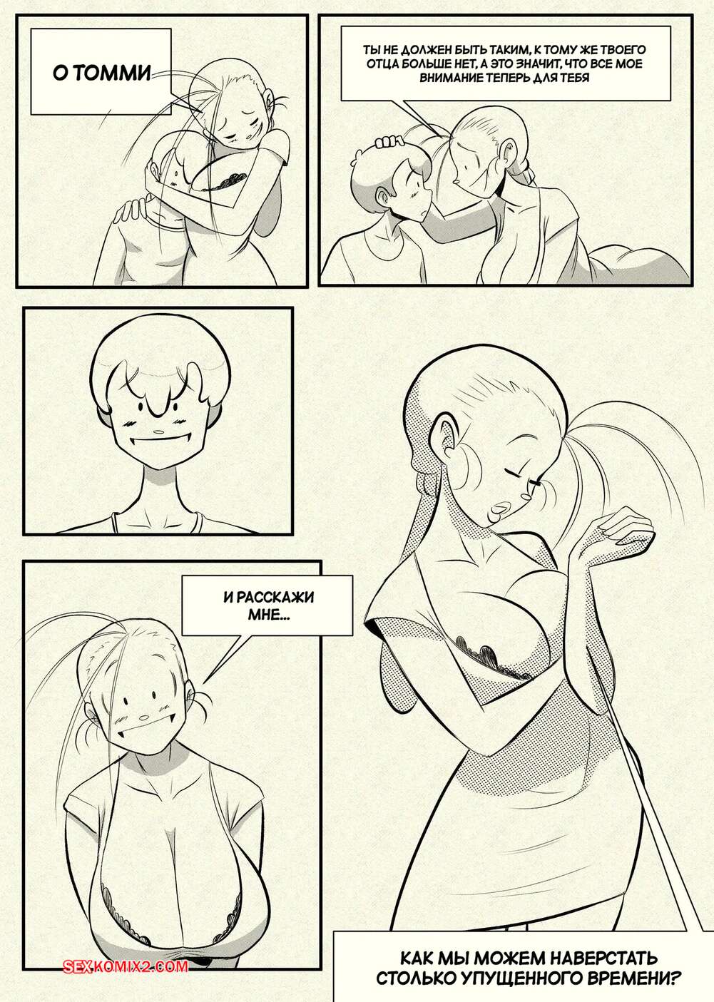 Порно комикс Ну очень наивная мама. Часть 1. Una Madre Muy Ingenua. Pinktoon. Томми без ума от шикарного тела своей горячей мачехи. Он стал дожидаться, когда она ляжет спать, посел чего приходит к ней в комнату, чтобы насладиться ее огромными сиськами и сочной задницей.