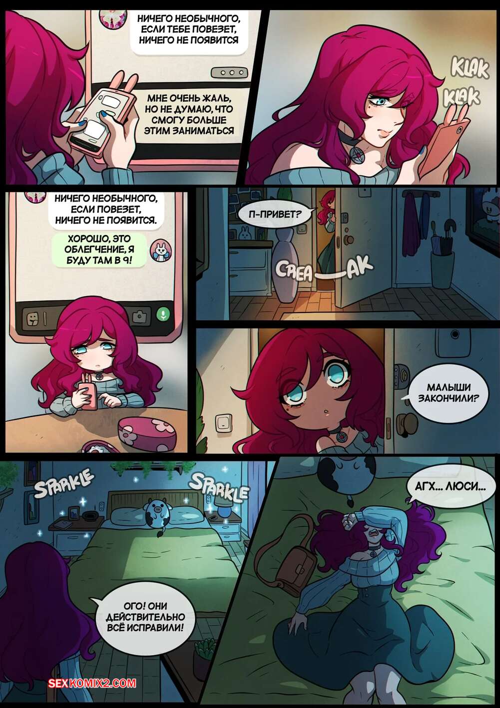 Порно комикс Волшебная мисс Люси. Часть 2. Magical Miss Lucy. Kinkymation Рыжая красотка легла спать но не могла уснуть изза возбуждения. Девушка стала ласкать пальчиками свою пизденку, представляя себя в объятиях своего дружка.