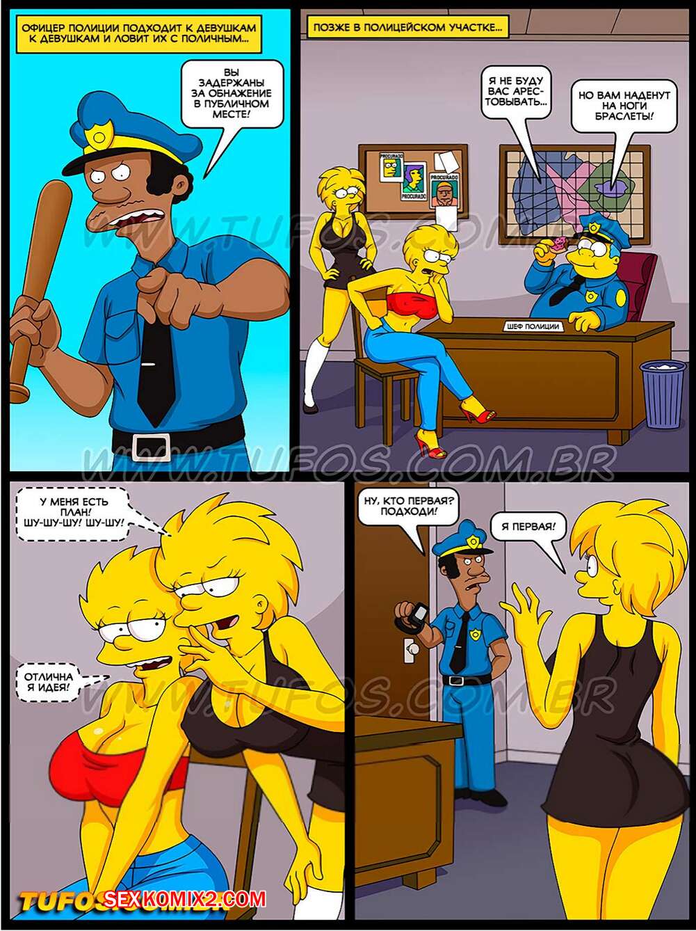 Порно комикс Симпсоны. Часть 31. Непристойная непристойность. Две горячие сестрички решали пописать в общественном месте, но их увидел зоркий полицейский и отвел в участок. Девушкам удалось избежать наказания с помощью своих кисок.