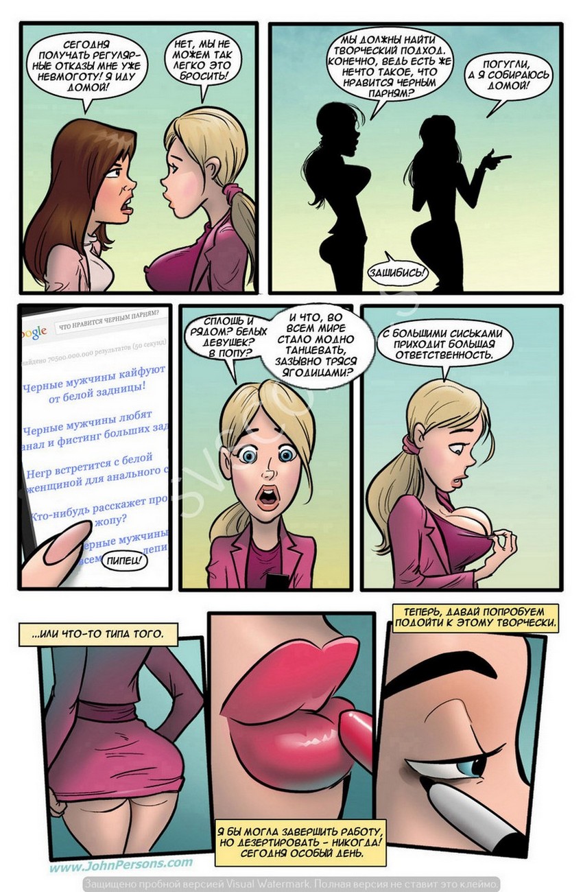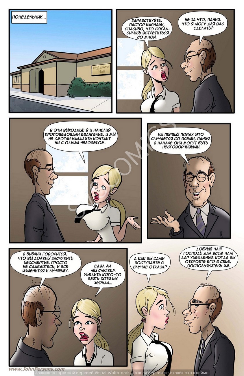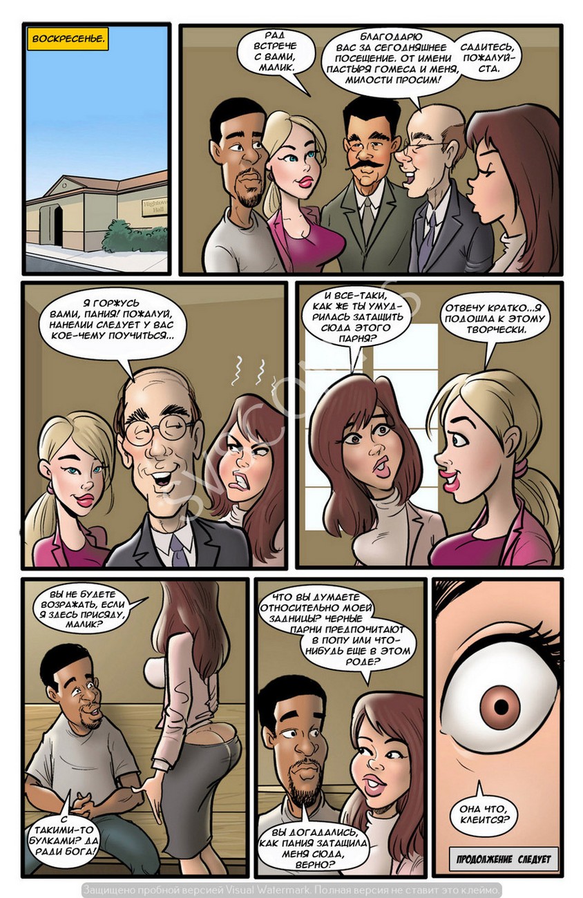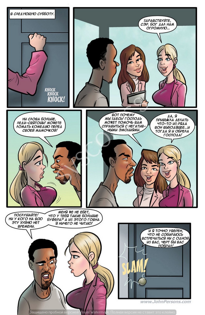 Порно комикс «Лазейка в рай. Часть 1». Молодая и горячая блондинка пытается делать хорошие дела, чтобы после смерти попасть в рай. Она ходит по домам и приглашает людей в свою ратушу, но никому это не интересно. Разочарованная она разговаривает с пастырем, и он ей советует лучше уговаривать людей. На следующий день девушка пошла в дом к чернокожему парню, и он согласился вступить в ратушу только если она ему сделает минет. Отчаявшись, красотка открывает свой сочный ротик и принимает большой черный член, всё ради дороги в рай!