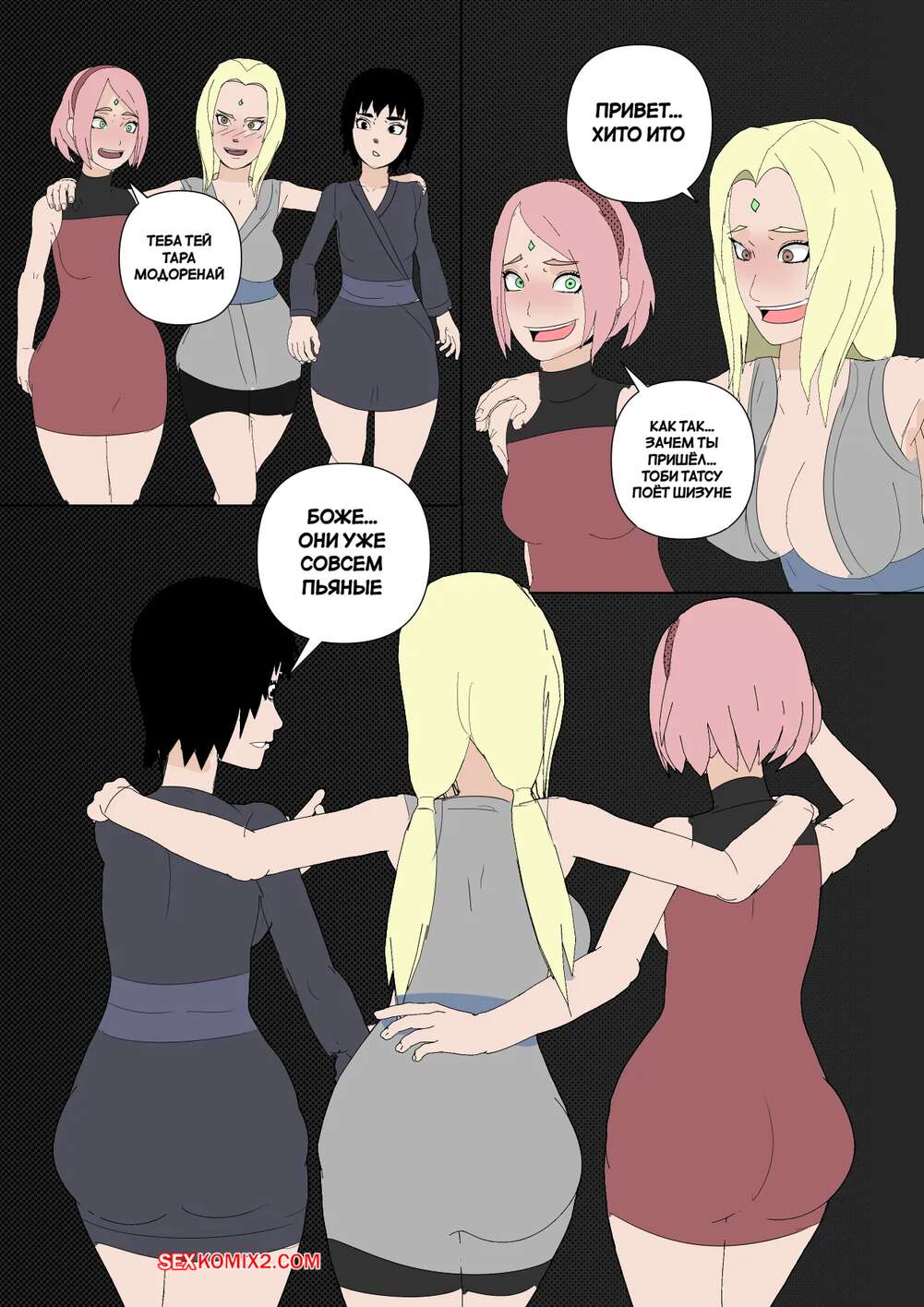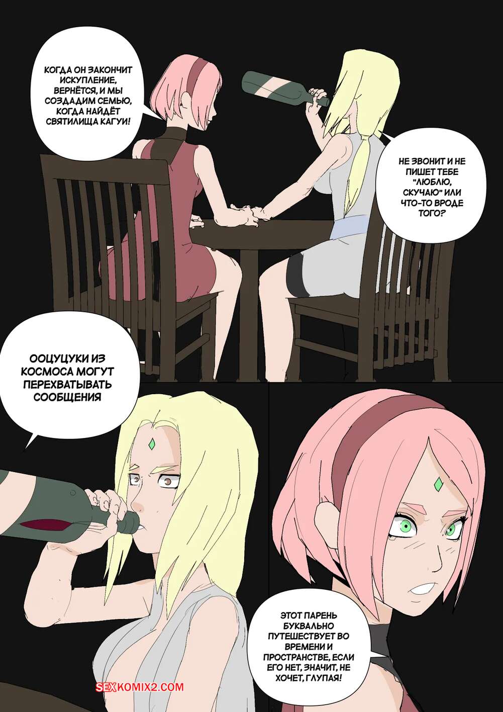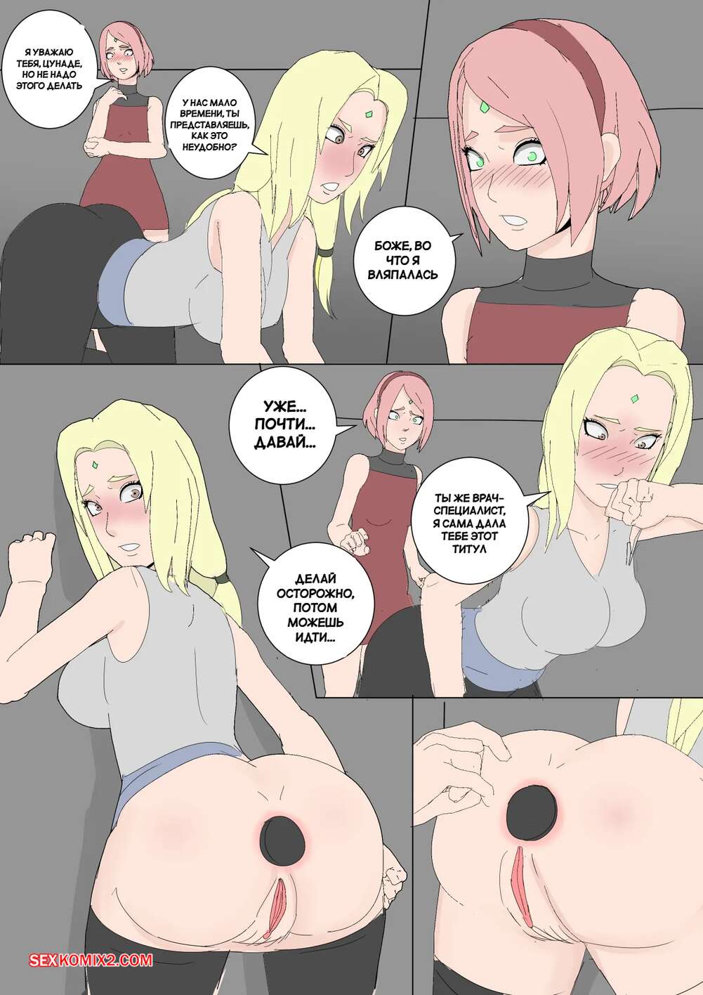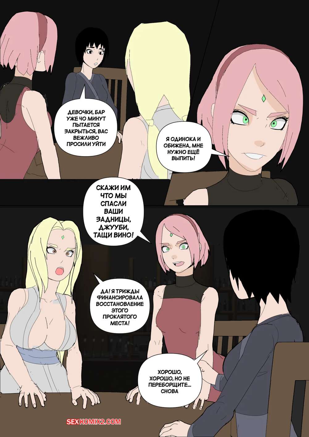 Порно комикс Наруто. Mangekyou. Часть 3. Drnihilismo Цунаде напилась и отправилась в гости к Сакуре. Она стала приставать к девушке и соблазнять ее, после чего разделась и продемонстрировала анальную пробку в своей заднице.