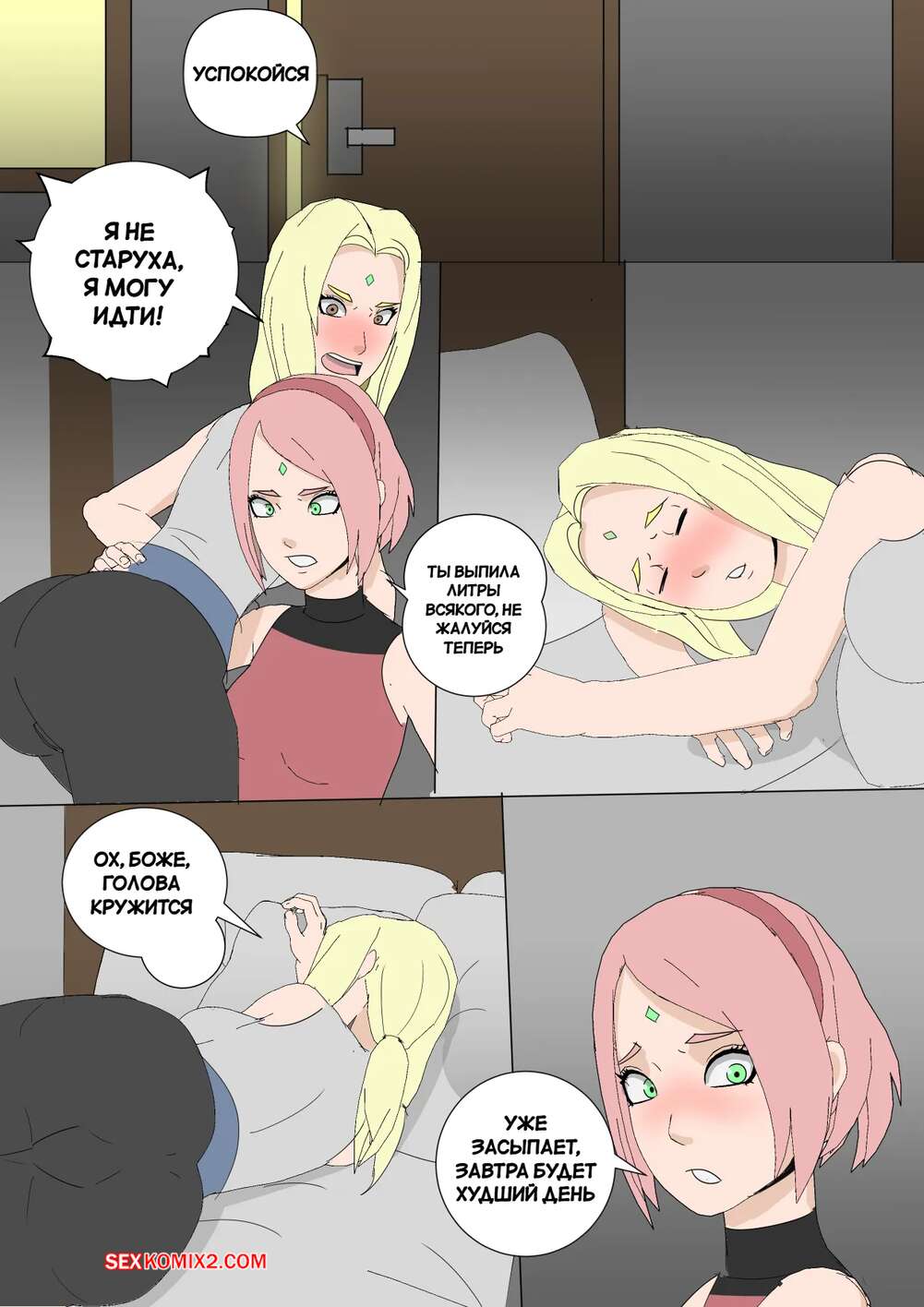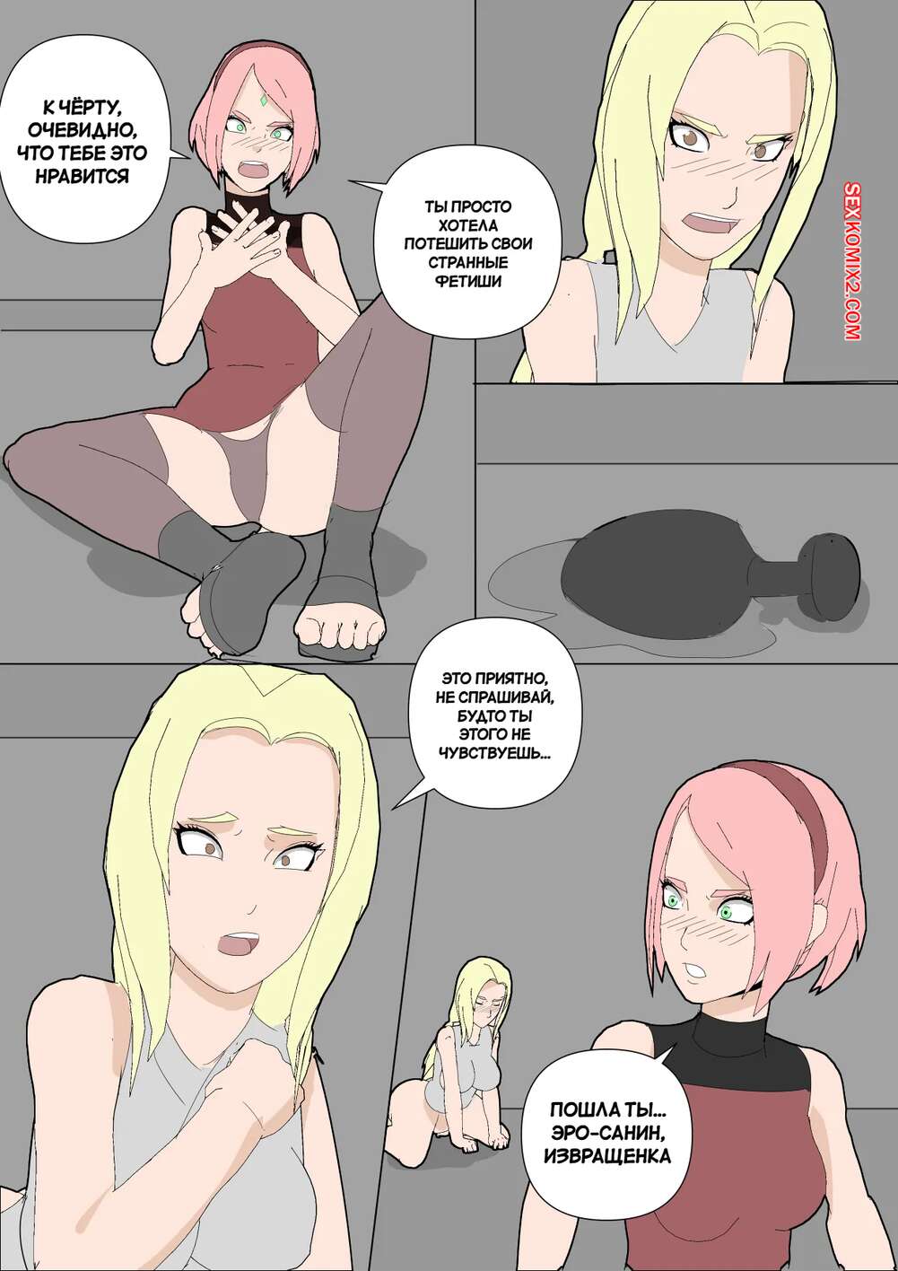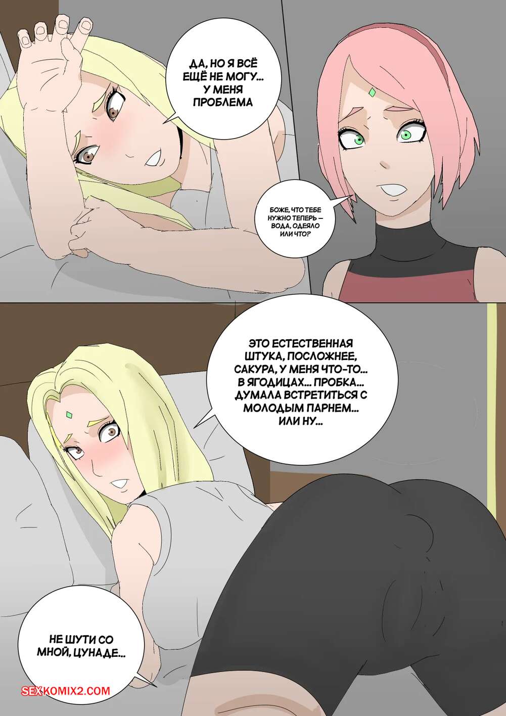 Порно комикс Наруто. Mangekyou. Часть 3. Drnihilismo Цунаде напилась и отправилась в гости к Сакуре. Она стала приставать к девушке и соблазнять ее, после чего разделась и продемонстрировала анальную пробку в своей заднице.