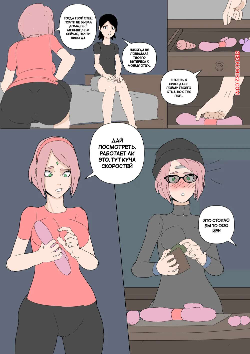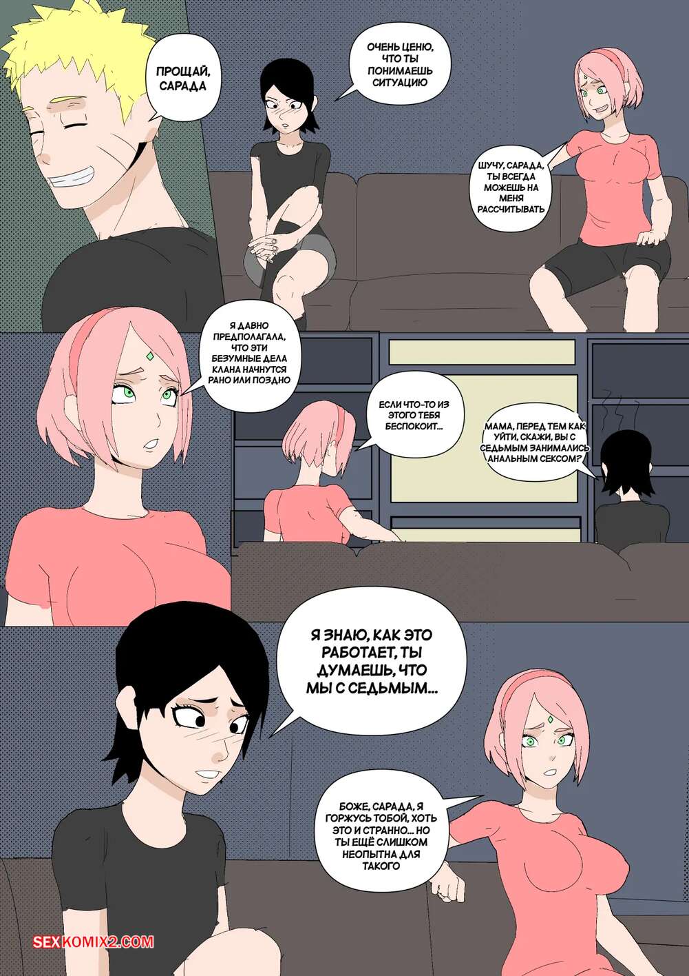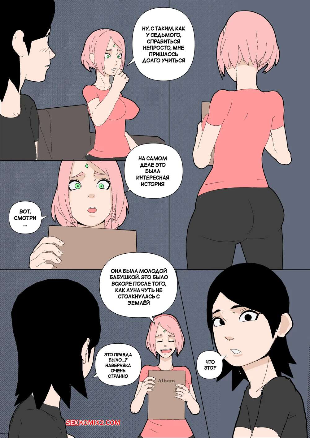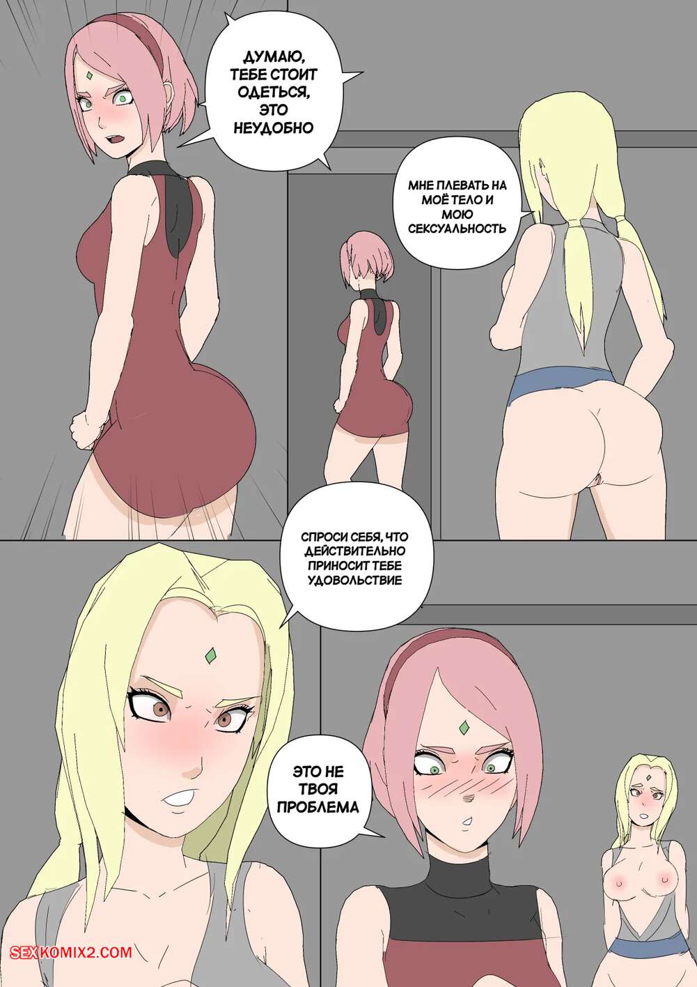 Порно комикс Наруто. Mangekyou. Часть 3. Drnihilismo Цунаде напилась и отправилась в гости к Сакуре. Она стала приставать к девушке и соблазнять ее, после чего разделась и продемонстрировала анальную пробку в своей заднице.