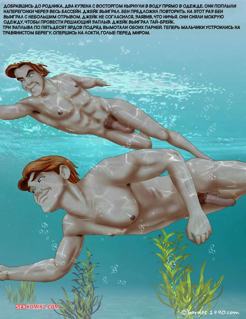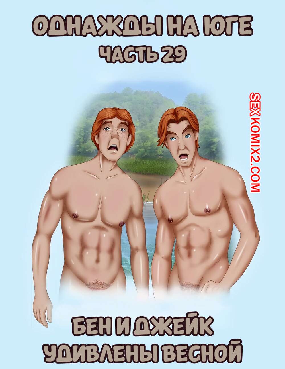 Порно комикс Однажды на юге. Часть 29. Once Upon a Time in the South. Bardot1990 Два друга решили расслабиться и пошли искупаться в озере голышом. Они лежали на траве и болтали, но вскоре компанию им составила темнокожая брюнетка, которая быстро возбудила друзей.