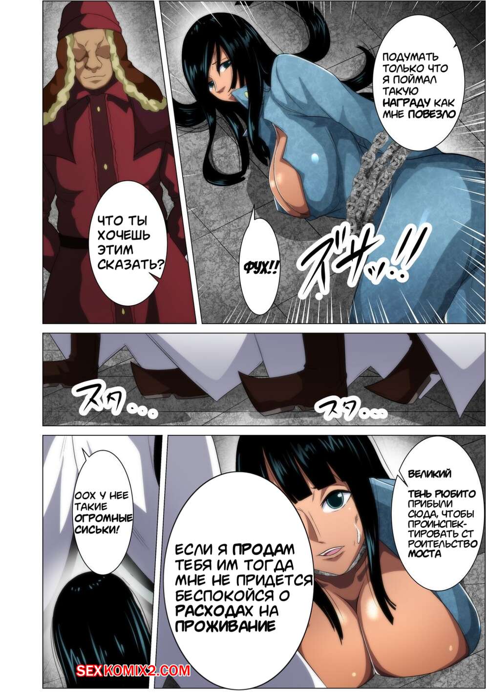 Порно комикс One Piece. Судьба пойманной большегрудой пиратки Девушка очнулась после долгого бессознания. Она обнаружила, что ее руки связаны и на ней ошейник. Ее взял в плен толстый китаец и стал использовать в своих сексуальных целях, трахая ее жестко раком.