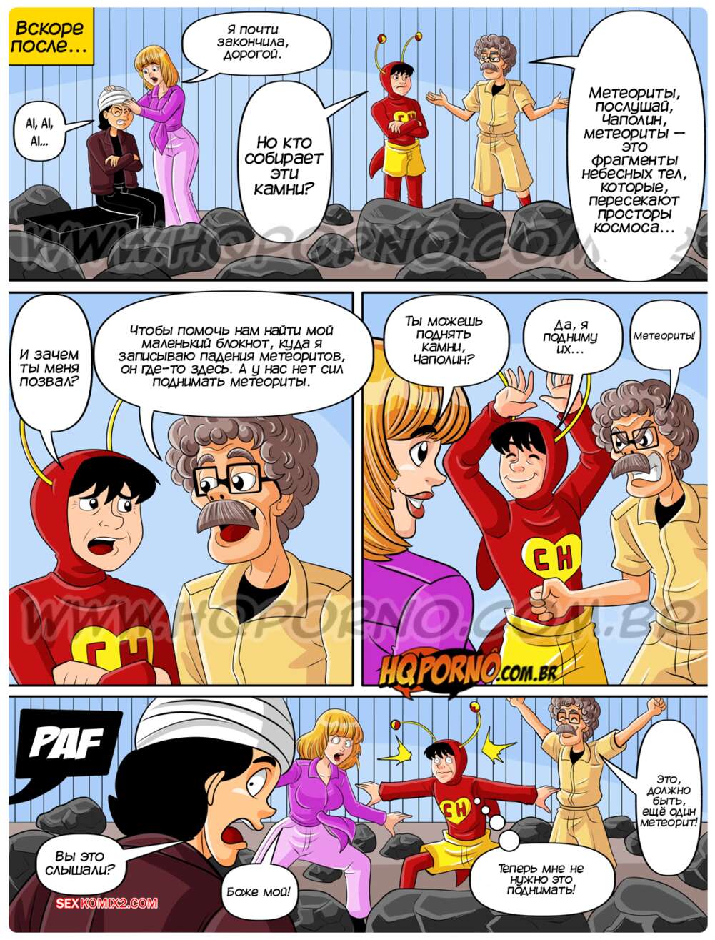 Порно комикс Чаполин. Часть 2. Chapoltoon. HQPorno Чаполин спас горячую блондинку от падения метеоритов и девушка решила его отблагодарить. Сучка взяла в ротик член героя, после чего дала ему себя выебать во все дырочки, пока ее парень за этим наблюдал.