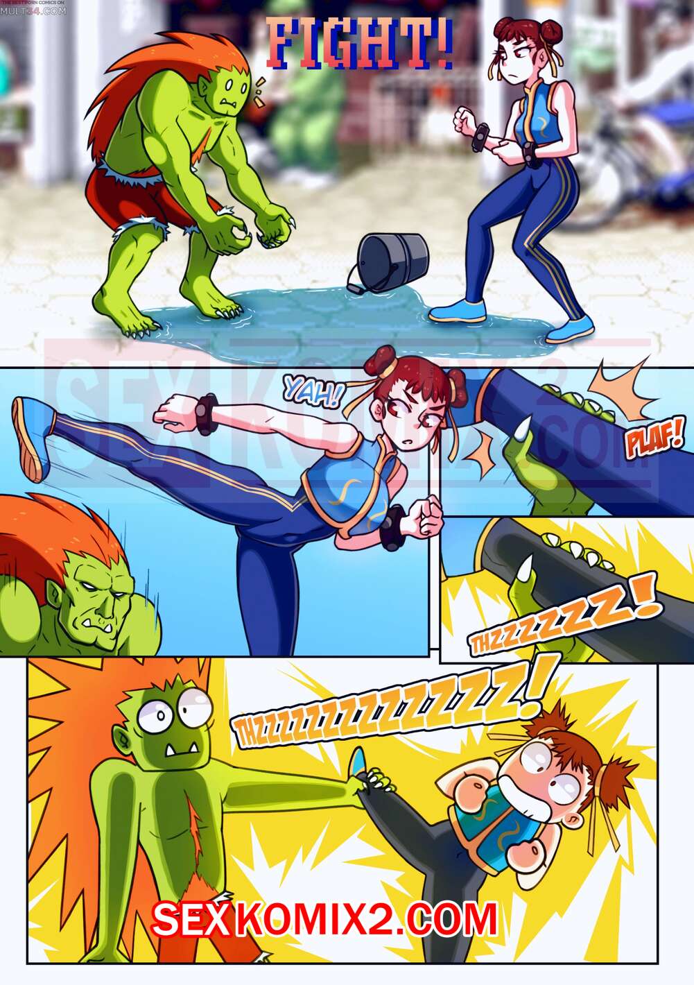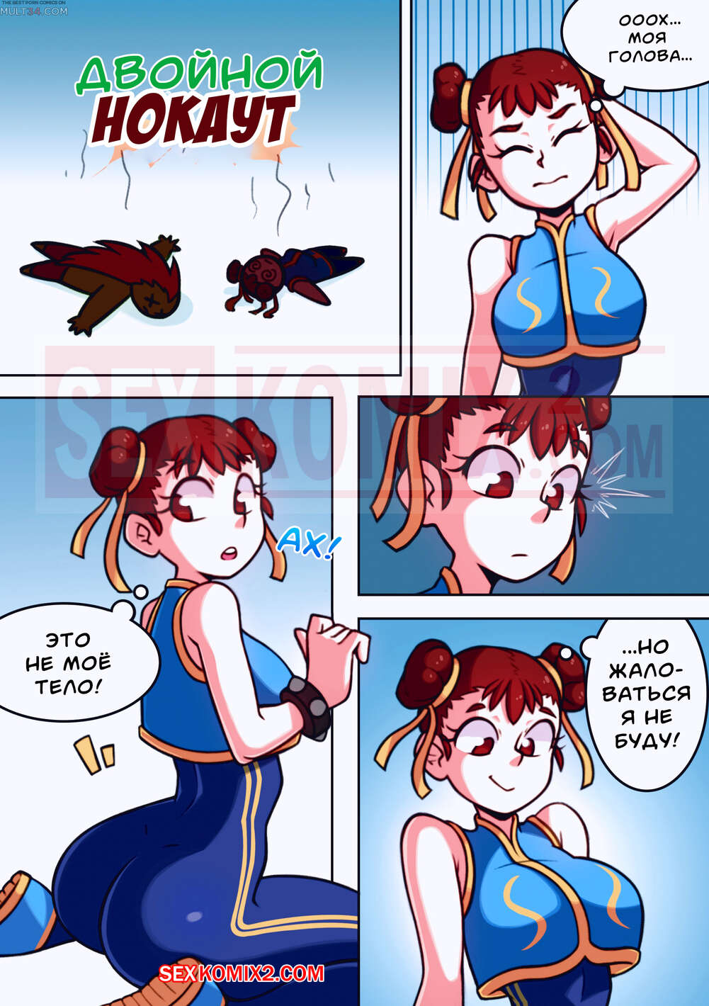 Порно комикс Уличный боец. Шокирующие Заключение. Во время схватки парень использовал свой супер удар электро шок. И из-за этого он поменялся телом со своей противницей, горячей брюнеткой. Но он не растерялся и начал забавляться с новым телом. Мастурбировать и трахаться себя.
